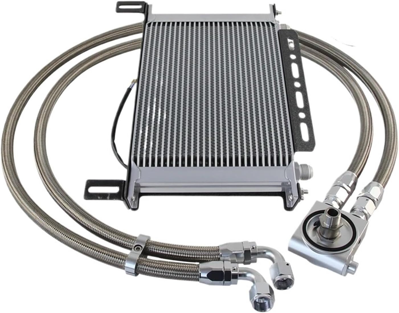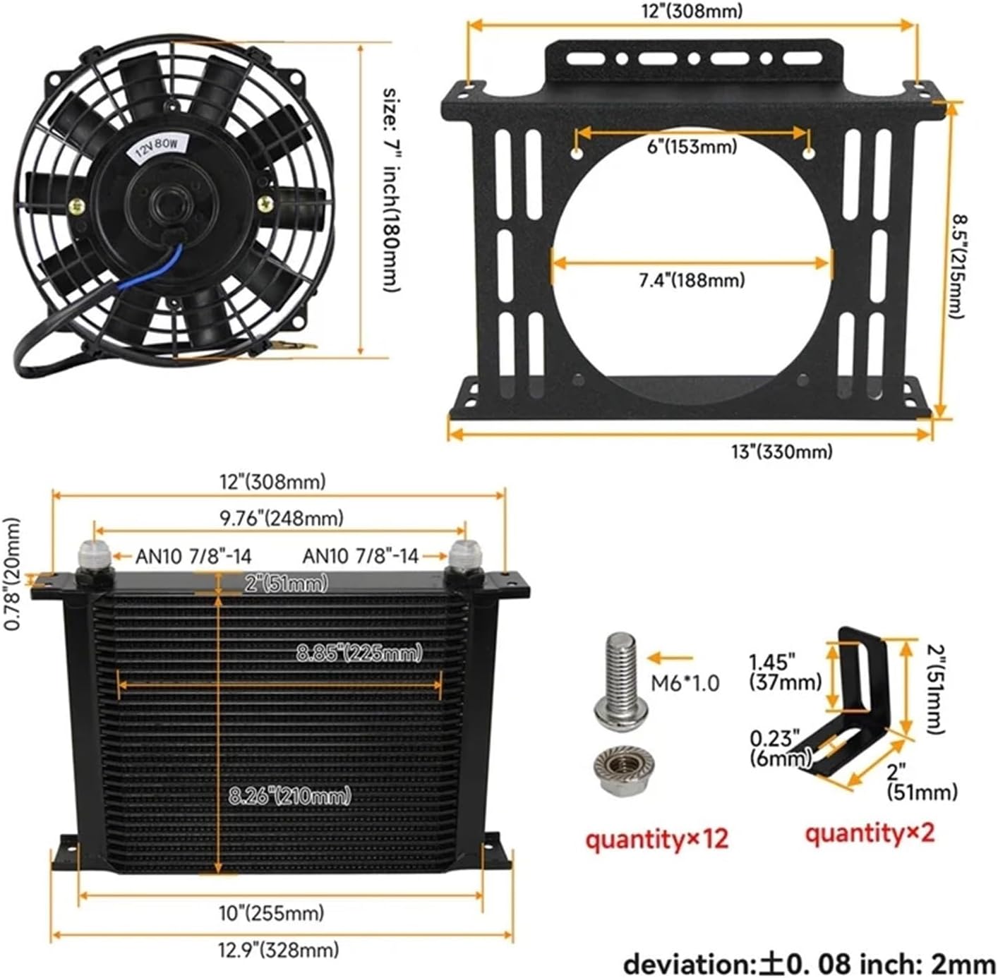 SizeInlet & Outlet Fitting AN10Inlet Outlet Center Distance of oil cooler 248mmOil filter fitting Thread 34X16 UNF and M20XP15FanFan Diameter 7Fan Depth 25CFM ratio 1400RPM 2250Voltage 12v 80wInclude1PCS oil cooler2PCS oil lines 14m and 1.6m )1Kit Mounting Brackets Kit1PCS aluminum thermostatic sandwich plate1Kit Electric Fan ==========Item Weight : 5.8kgItem Height : 16cmItem Width : 31cmItem Length : 38cmItem Type : Cooling SystemMaterial : Aluminum