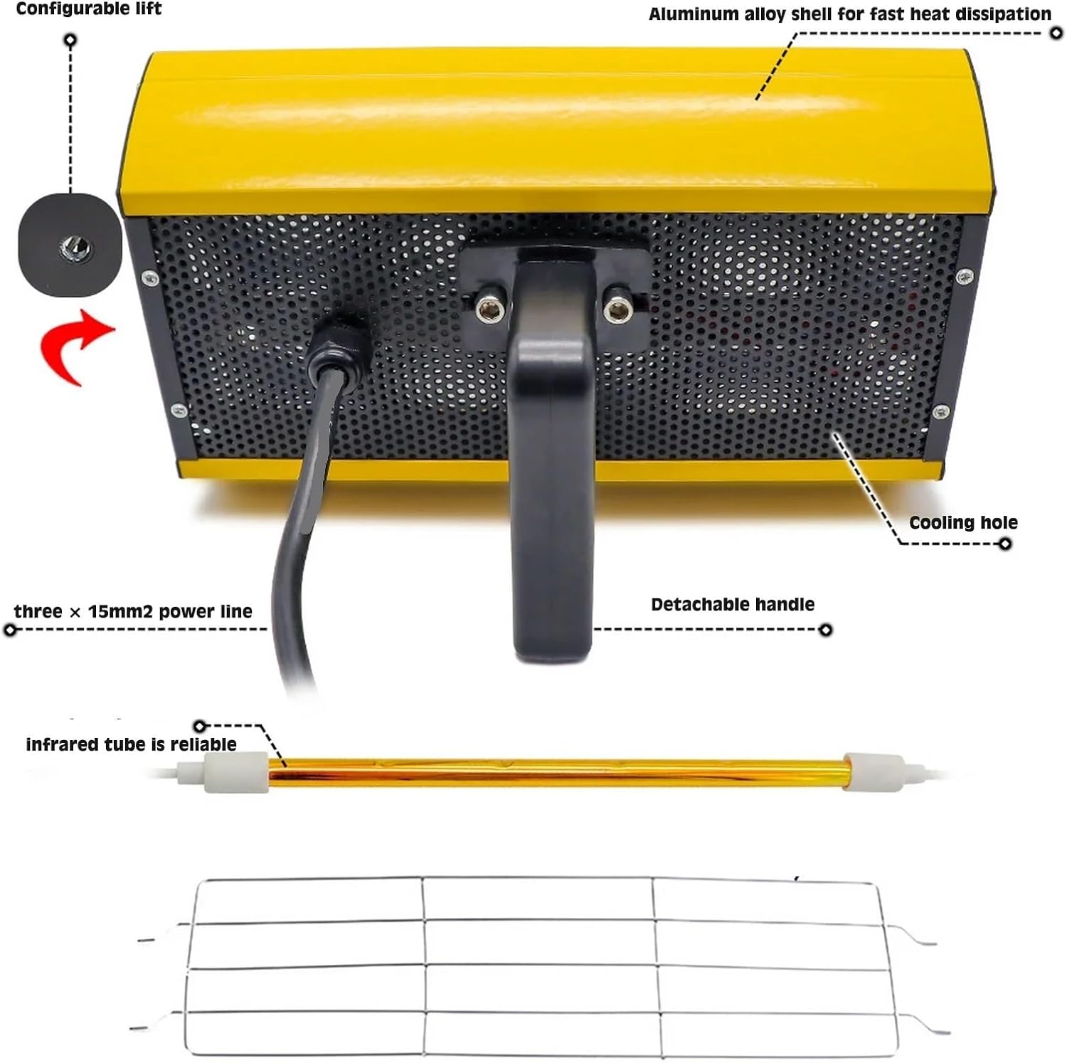 Features:1. The infrared paint spray lamp adopts a comfortable control handle and angle design, which is easy to operate.2. The car painting lamp is suitable for on-site repair, engine drying, car putty, drying filler, drying primer or preheating before spraying, etc.3. Anti-interference, high thermal efficiency, strong penetration and fast drying.Product parameters:Product Name: Handheld Infrared Paint Spray LampPower: 2000 wattsProduct material: aluminum alloyVoltage: 50 Hz/60 HzCuring area: 350*400mmTube length: 270 mmWorking temperature: 0-200℃=========Application: Infrared heating lamp