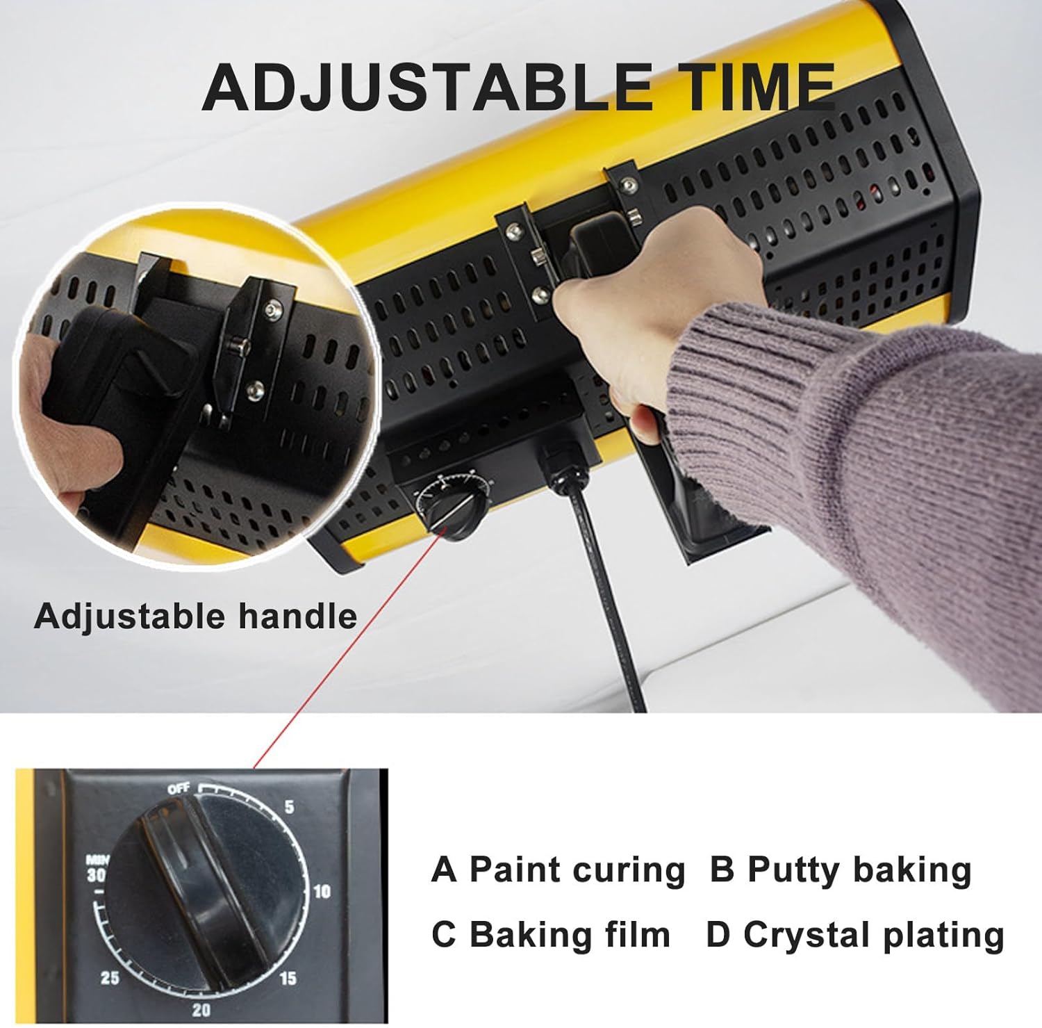 The Paint Curing Lamp uses infrared short-wave radiation heating technology, high heating efficiency, strong penetration. It is widely used in car paint room, local paint drying, dry putty, car paint paint room, heater, printing dryer, various drying equipment, furniture paint and other fieldsFeatures:- Infrared short-wave radiation heating technology, high heating efficiency, strong penetration- With a curing area of 50X60cm (19.69X23.62in), it ensures thorough and uniform heat distribution- With the stainless steel mirror allows for fast heating, allowing internal heat to shorten curing time- Equipped with a convenient 0-30 minutes intelligent timing function- With the adjustable stand, the height and angle can be adjusted- The heat dissipation hole design greatly enhances the heat dissipation functionParameters:Temperature: 0-100℃Voltage: 110V/220VWeight: 2.2KGPower: 1050WPower cord length: 4MHeating area: 50X60cm (19.69X23.62in)Packing list:1 X Handheld baking lamp1 X Adjustable bracket