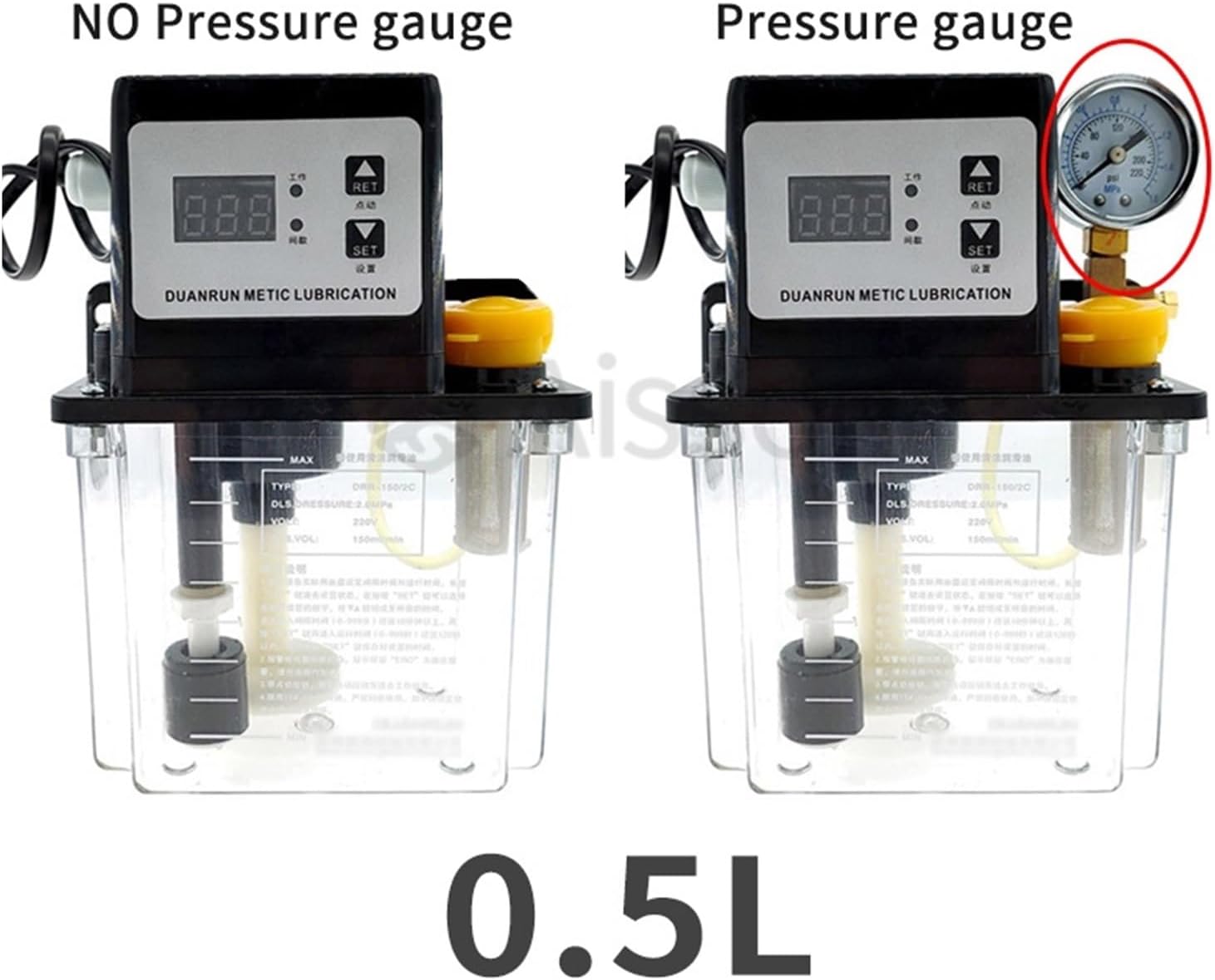 Rated pressure10kgCurrent0.35AVomit volume50mI / minVoltage220VPlot ratio75%Power28WOperating capacity0.5L/1L/2LRun / interval1 ~ 999SSuitable oil viscosity15 ~ 68c. St==========Application : CNC control solenoid PumpTheory : Electromagnetic PumpStructure : Booster PumpModel Number : DCR50Power : ElectricStandard or Nonstandard : StandardPressure : Low PressureUsage : Booster PumpFuel : Electric