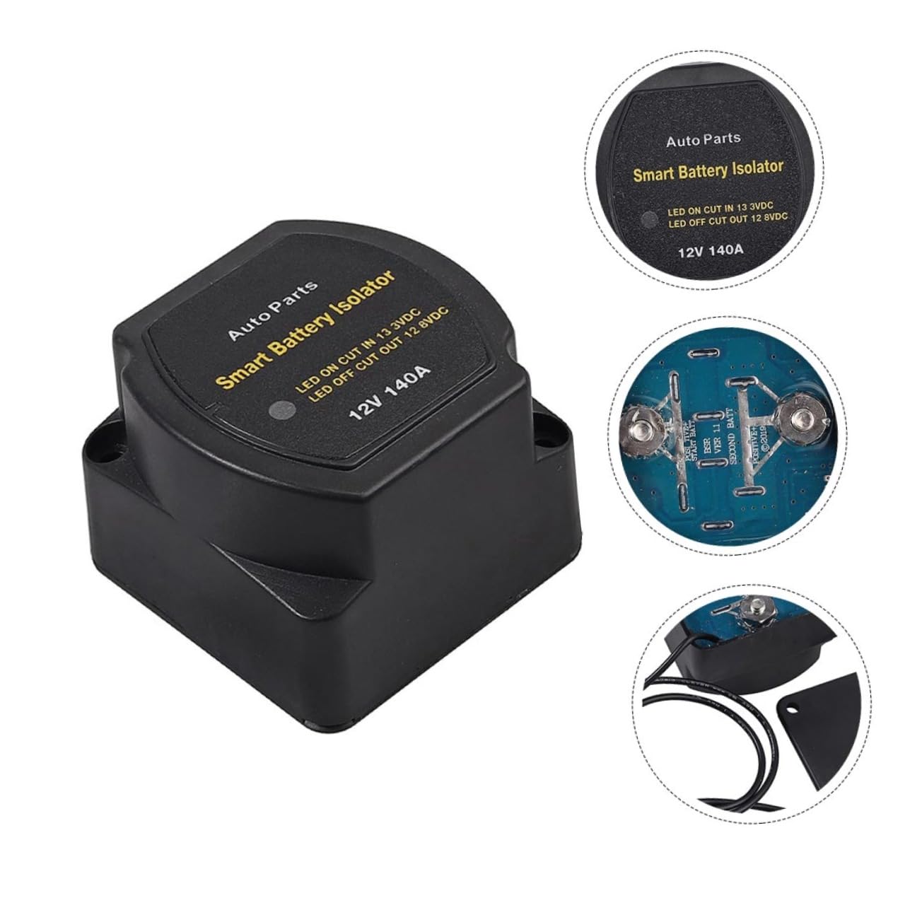 Package List 1 set x relay kit Characteristics - consumption-standby: 8mA Isolator for Car. -Continuous : 140A 12V 140A Relay. -Maximum : 160A Automatic Isolator Kit. - Size: About 6.80X6.80X5.30cm/2.67X2.67X2.08in Automatic Relay for Car. - consumption-charging: 280mA Dual Battery Isolator. - Color: Black Automatic Relay. -Recommended fuse: 80Amp Car Relay. - Material: Plastic, aluminum, copper 12V 140A Isolator. -Detachment delay: 5-10 seconds Dual Battery Relay. - Suitable for ATV, UTV, Boats, RV's,marine vehicle, truck, Voltage Sensing Relay. - materials and good craftsmanship ensure its durability . - Easy to install and replace the old one. Can be directly replaced, and high strength and durability Double Battery Relay. - This battery isolator is small and suitable for almost anywhere Car Accessories. - This relay can be used safely in dusty, humid and unexpectedly bad weather environments Voltage Relay.Goods InformationAutomatic Isolator Kit This is a charging relay, made of materials, which can serve US for a long time.Car Relay The dual battery isolator kit enables your accessories to run from a separate battery while the engine is not running on your vehicle while keeping your main battery charged and your vehicle to go and start when you want It