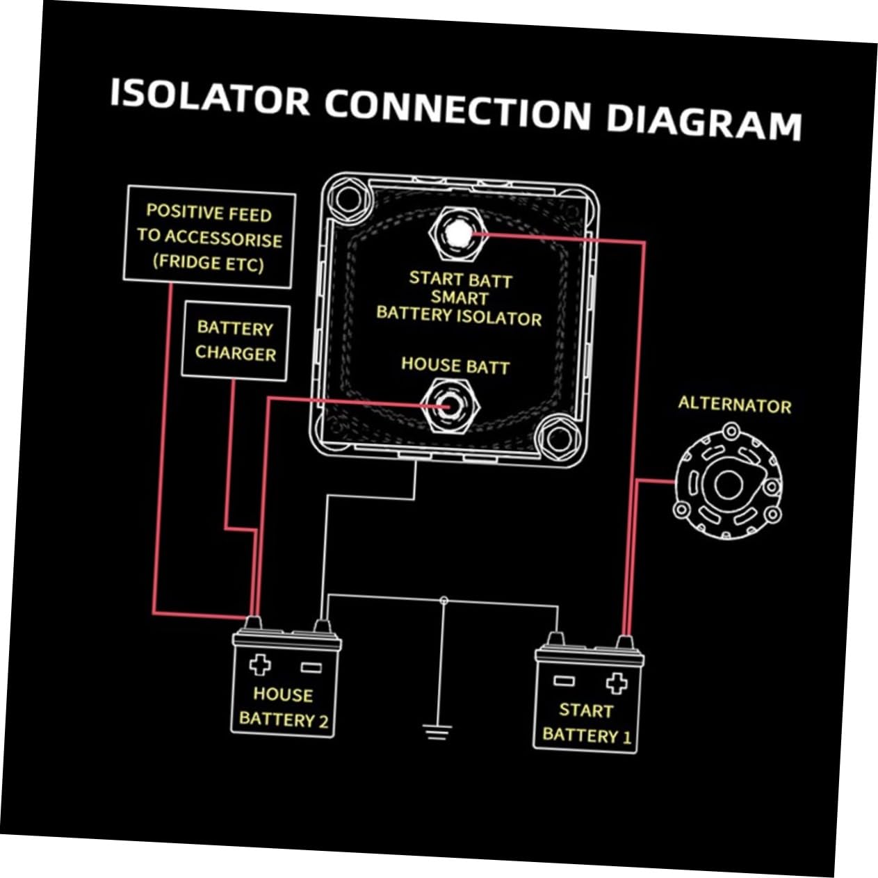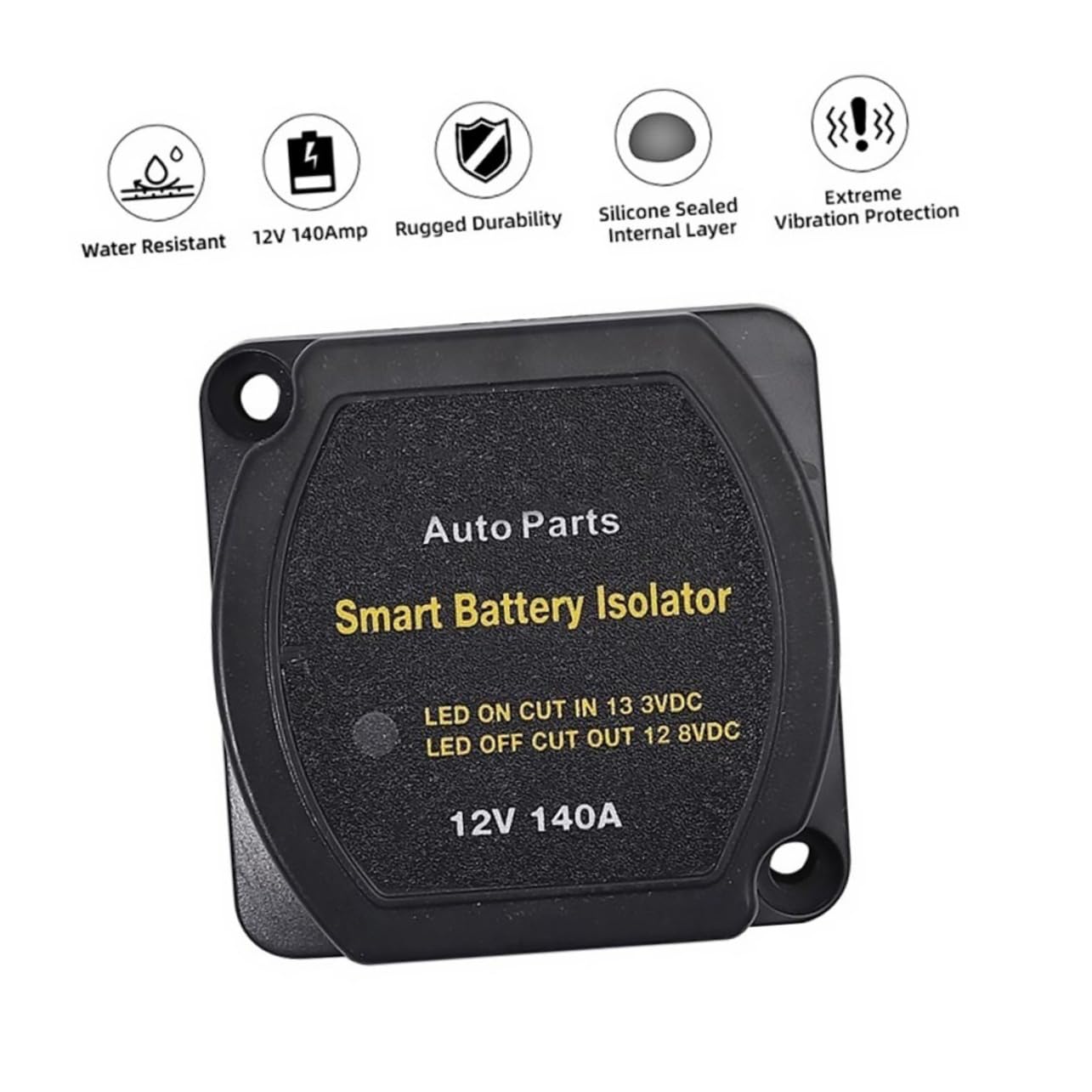 Package Include 1 set x relay kit Features -Maximum : 160A 12V 140A Isolator. - consumption-standby: 8mA Voltage Relay. -Recommended fuse: 80Amp Dual Battery Isolator. - consumption-charging: 280mA Double Battery Relay. - Color: Black Automatic Isolator Kit. -Continuous : 140A 12V 140A Relay. -Detachment delay: 5-10 seconds Voltage Sensing Relay. - Size: About 6.80X6.80X5.30cm/2.67X2.67X2.08in Smart Isolator. - Material: Plastic, aluminum, copper Automatic Relay for Car. - This compact battery insulator is so small that it can fit almost anywhere! Dual Battery Relay - This is a useful car accessory that allows your car to function normally Car Accessories. - This relay can be used in vehicles such as car, RVs, and ships Isolator for Car. - It has a voltage sensing chip to ensure that the main battery is for the vehicle to drive Isolator. - It is made of materials and has a Car Relay.Goods Description12V 140A Relay It features a voltage chip ensuring your primary battery is for your vehicle to run.Voltage Sensing Relay This dual battery isolator is also built to withstand bad weather environments, vibration and is water resistant.Voltage Relay This dual battery isolator kit is all you need to charge a dual battery system