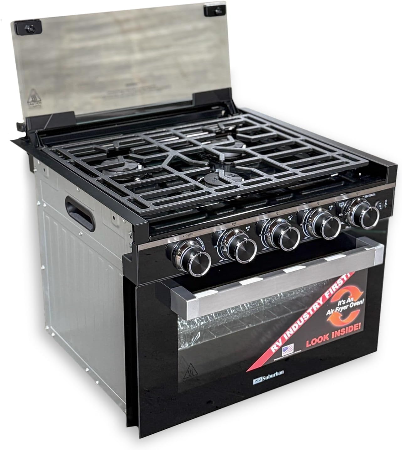 Features Elevate your culinary skills & enjoy hassle-free frying with rapid hot air circulation. Ditch conventional ovens for quicker, healthier cooking! Larger viewing window with interior light for checking on progress without opening range door. Enhanced safety & style: Backlit LED control knobs for your griddle - red for on, soft white for off. Cast iron grate that elegantly details the cook top while being durable and removable for easy clean up. Comes complete with mesh frying tray and drip pan! Makes for easy cleaning. Specifications Dimensions 20.75"h x 24"l x 26"w Watts 1440 Amps 12 Volts 13 / 120 Fuel Type LP