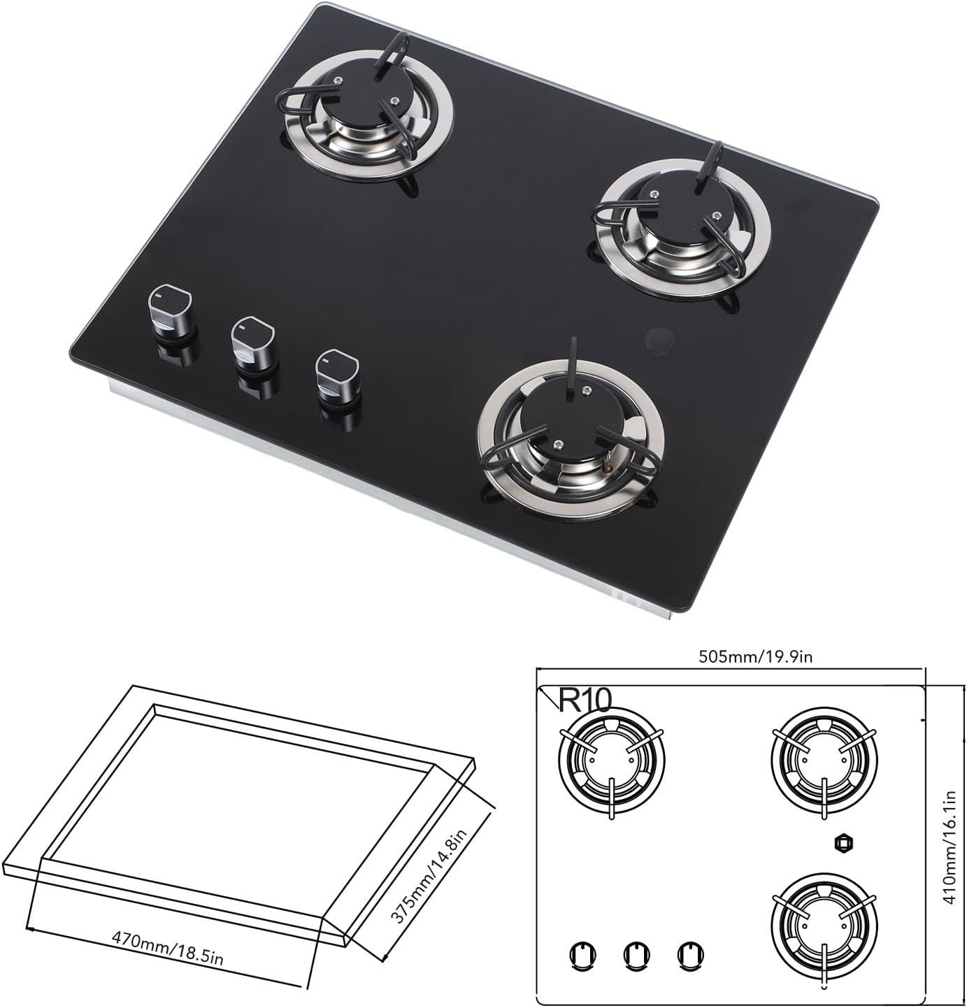 Item Type: Gas Stove TopMaterial: Tempered Glass Panel + Stainless Steel BaseOutput Power: 1.8Kw x 3Installation: Countertop or Built inTempered Panel Size: Approx. 505 x 410mm / 19.9 x 16.1in (countertop height 70mm/2.76in)Built in Installation Opening Size: Approx. 470 x 375mm / 18.5 x 14.8inFuel: LPG Gas OnlyIgnition: Electronic Ignition, Pulse IgnitionBattery: D Battery x 1 (not included)Length of Gas Pipe: Approx. 1.6m / 5.25ft (the connection part has been matched with the gas cooker and can be connected directly)Applicable: Great for caravan, motorhome, boat, RV, horsebox, etc.Package List:1 x Gas Stove Top1 x Gas Pipe