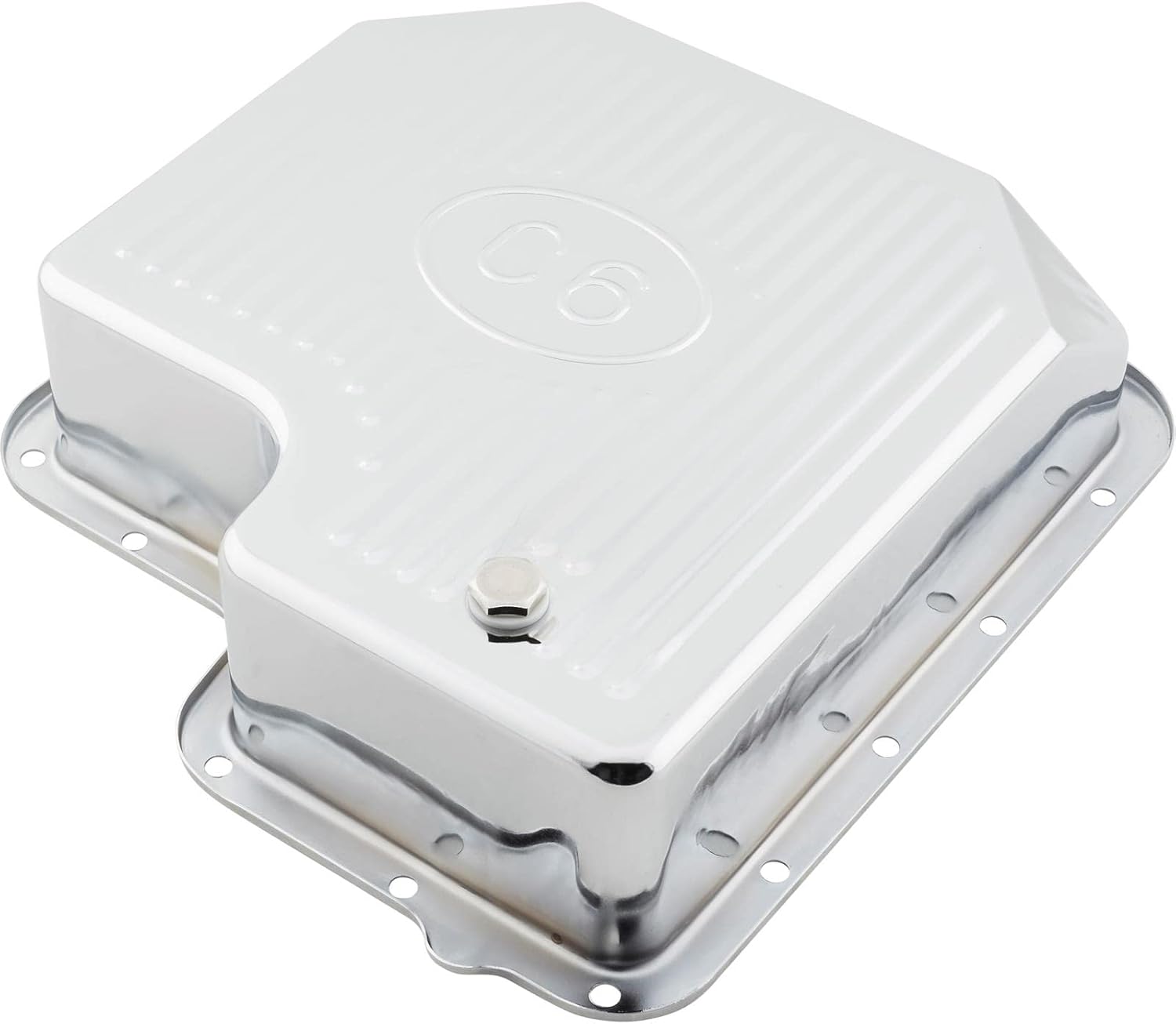 Our steel transmission pans are made out of high quality steel and designed to fitCompatible with Ford C6 transmissions. The ribbed design aids in cooling your transmission fluid in high demanding situations. The extra capacity, 3-1/2" depth adds an additional 2 quarts of transmission fluid. Available in a chrome finish and includes a drain plug. Features: Extra Capacity (+2 Quarts) Ribbed for better cooling and performance. Available in chrome. Easy installation.