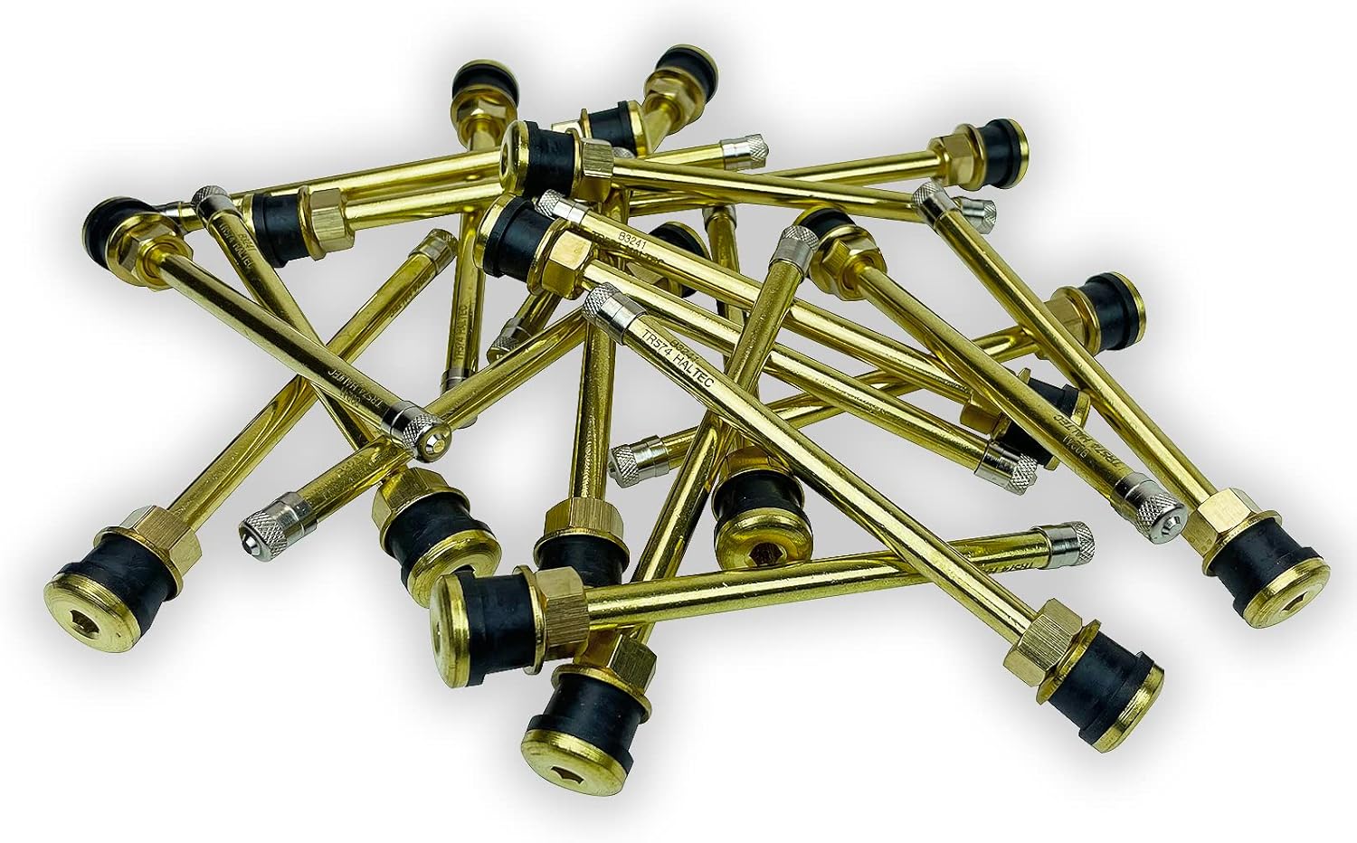 Haltec's TV-574A straight brass clamp in tubeless valve stems are rigorously tested and designed for use in commercial applications. These fit all standard 5/8 inch (0.625 inch) valve stem holes and are 5 inch inches long. Haltec's TV-574A valve stems are equipped with EPDM grommets that are formulated and manufactured in the USA along with high temperature valve cores.