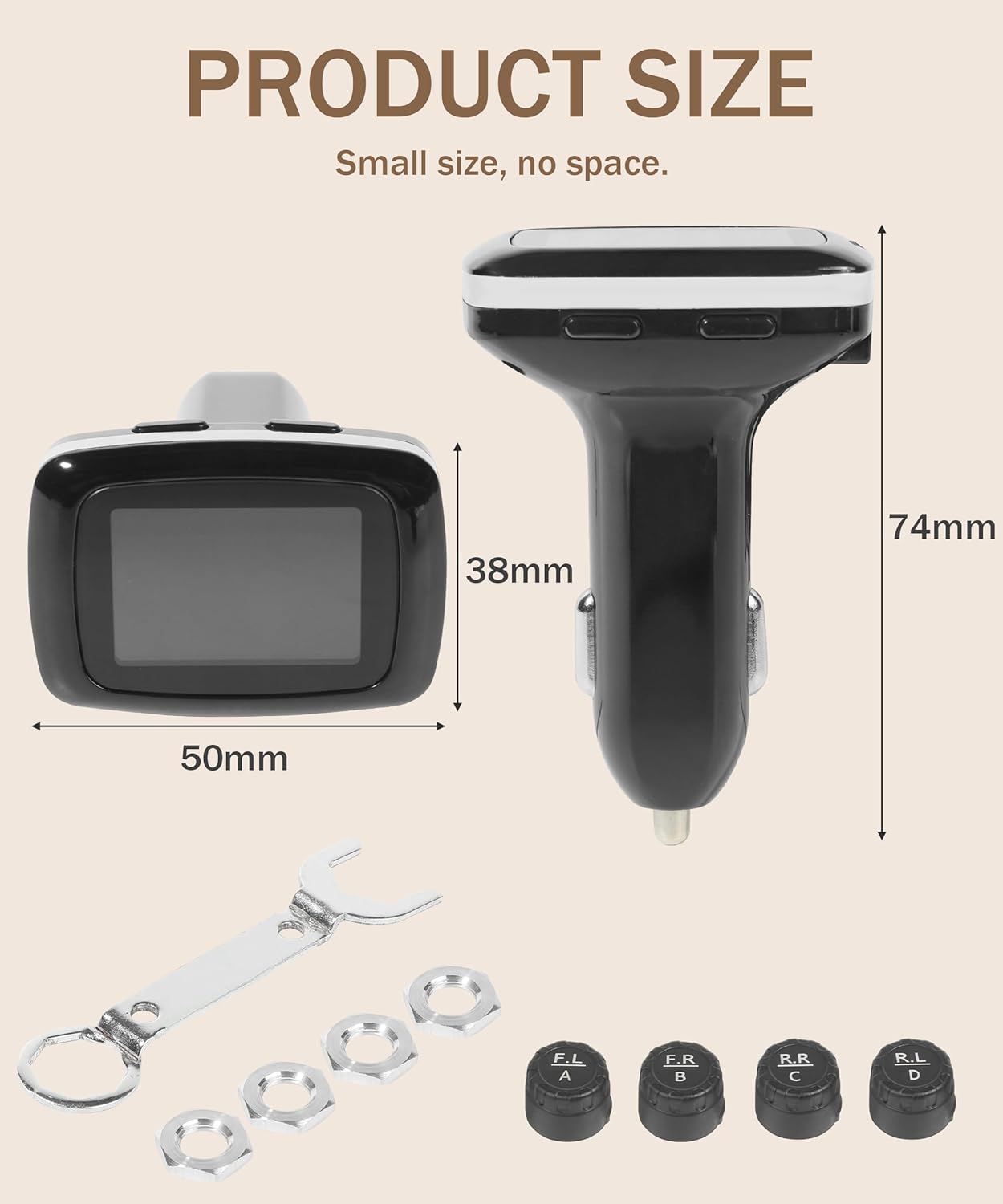 Specifications:Maximum dynamic working distance: 19.7 feetMaximum monitoring pressure value: 87 PSIPackage List:1x tire pressure monitoring system TPMS4x waterproof external sensorFeatures:Simply insert the car cigarette lighter and turn on the monitor, and install the four sensors on the tires. The monitor will display the tire pressure value.Made of high-quality materials with built-in high-tech chips, fast transmission speed and high precision.4 external sensors have functions such as waterproof, snow proof, and anti-static, which can accurately measure pressure and temperature, and receive signals in real time.