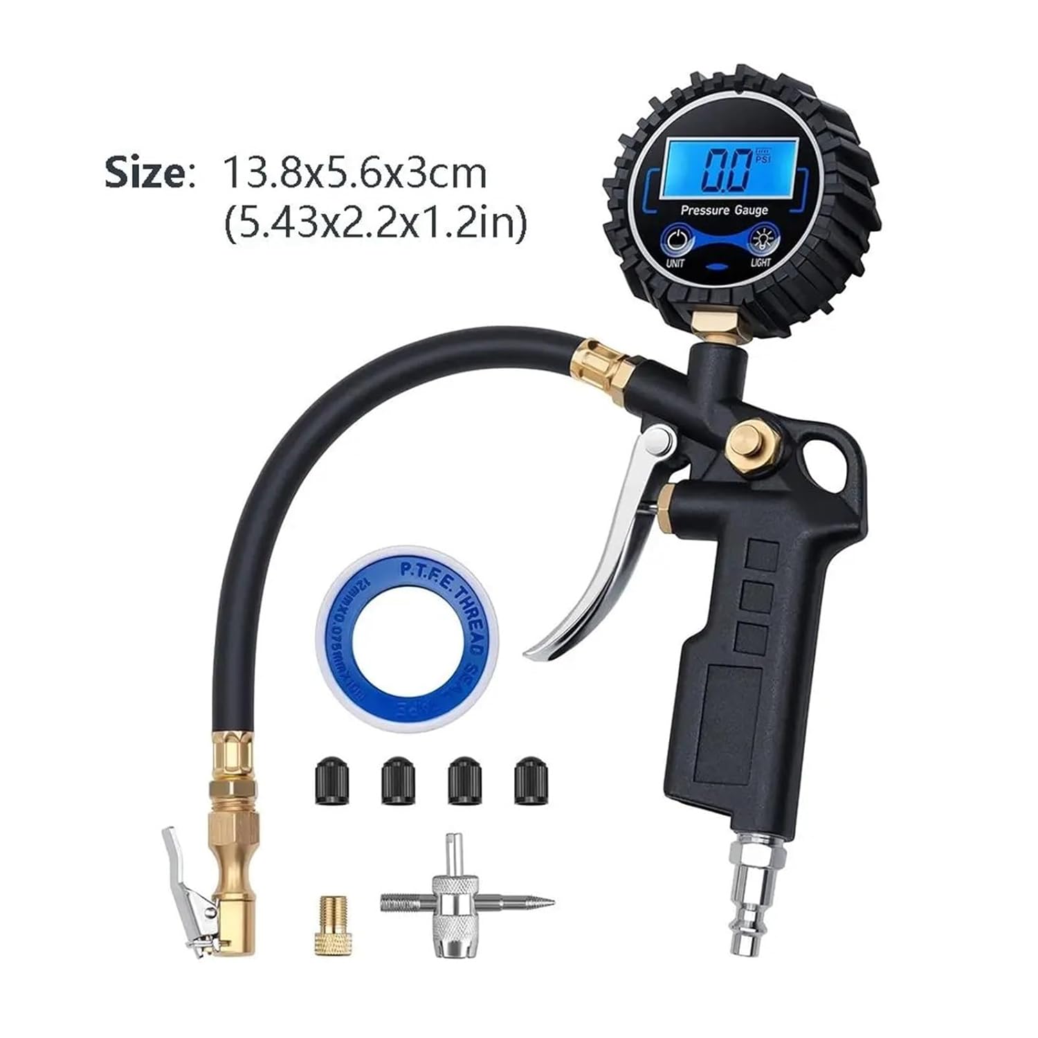 Size:13.8x5.6x3cm(5.43x2.20x1.18in)Color:blackMaterial:Metal+ABSPackage includes:1 Set Digital Tire Pressure GaugeWelcome to our store! We offer a wide selection of products and strive to provide you with a comfortable and satisfying shopping experience.