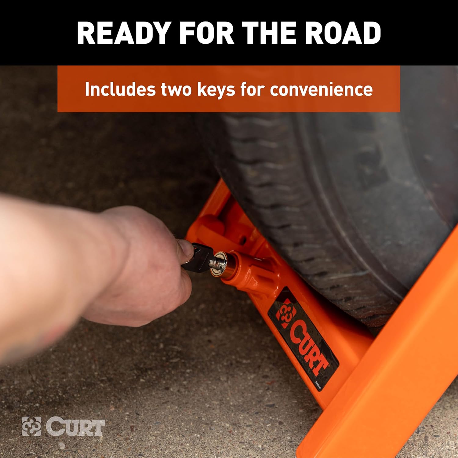 Keep your trailer, RV, or vehicle secure when unattended with the CURT Adjustable Trailer Wheel Lock. Designed to clamp directly onto the wheel, this high-strength lock immobilizes the tire to help deter theft and prevent roll-away. With an adjustable design that fits most tire sizes—from 7-1/4” to 12-7/8” wide and 7-3/4” to 10-3/4” long—it offers versatile protection for a wide range of trailers and vehicles. The vibrant orange, rubber-coated arms not only increase visibility but also protect your wheel’s finish from scratches. Engineered to withstand the elements, this wheel lock features a durable powder coat finish and a watertight dust cap that guards against internal corrosion. The included T-tool makes adjustments fast and easy, while the two provided keys offer added peace of mind. Backed by a limited lifetime warranty with one year on finish and parts, the CURT Adjustable Trailer Wheel Lock is a dependable security solution you can count on.