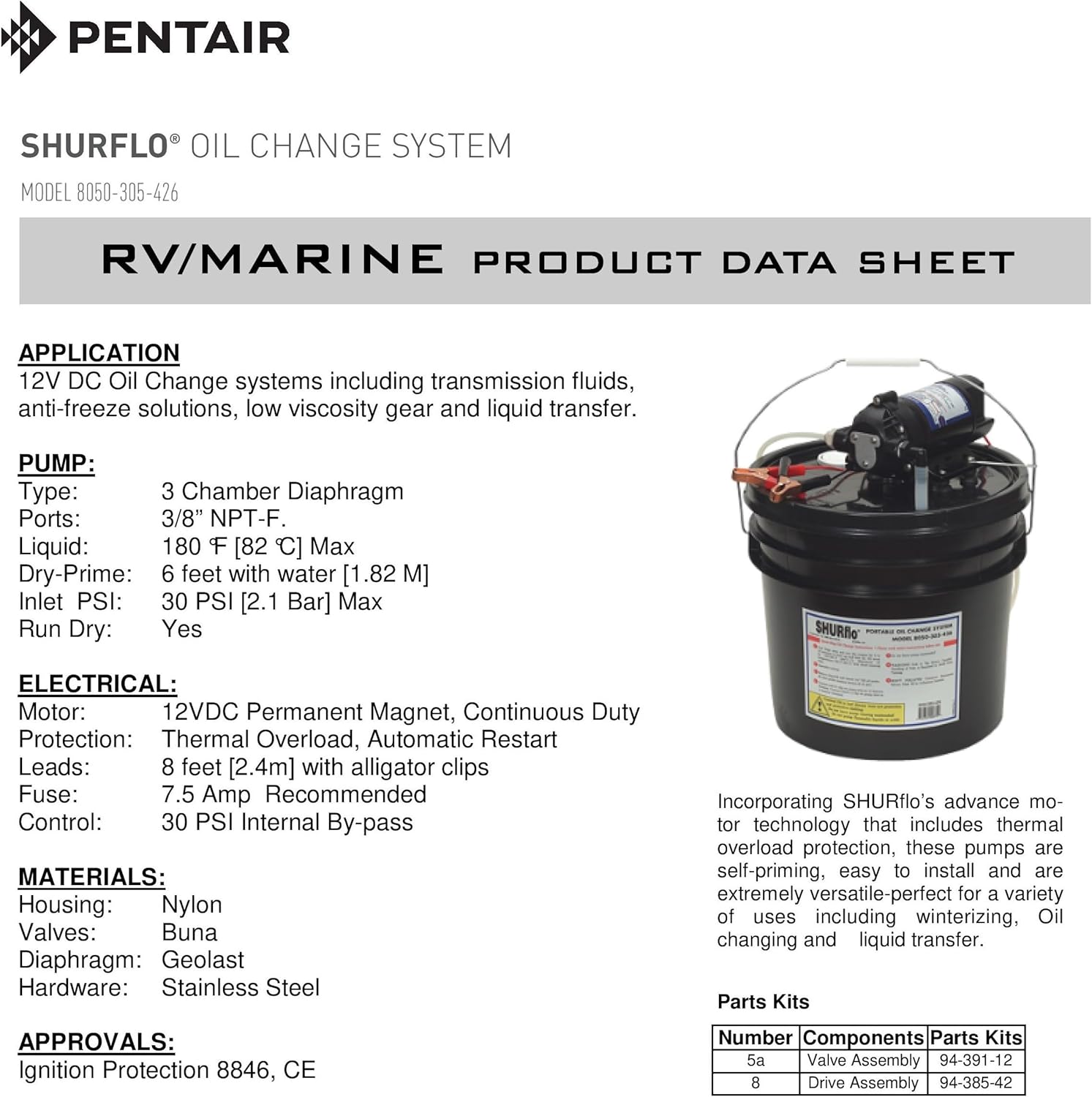 The PENTAIR SHURFLO 8050-305-426 Oil Change Winterizing System is a versatile, self-priming 12 V DC liquid transfer and pump kit ideal for marine and RV maintenance tasks such as changing engine oil, flushing antifreeze, winterizing cooling systems, and general fluid transfer. It includes a premium three-chamber diaphragm pump with thermal overload protection, an 8-foot cable with battery clips, a hose kit, and a 3.5 gallon (≈13 L) storage container/bucket to collect and hold pumped fluids. Designed for easy installation and operation, the system can run dry without damage, handles fluids like engine oil, transmission fluid, low-viscosity gear lube, and antifreeze, and delivers around 1.5 GPM (5.6 L/min) through 3/8″ NPT female ports. Its durable construction and included accessories make it a practical solution for clean, efficient oil changes, winterizing tasks, and other liquid transfer jobs on boats, RVs, and similar vehicles.