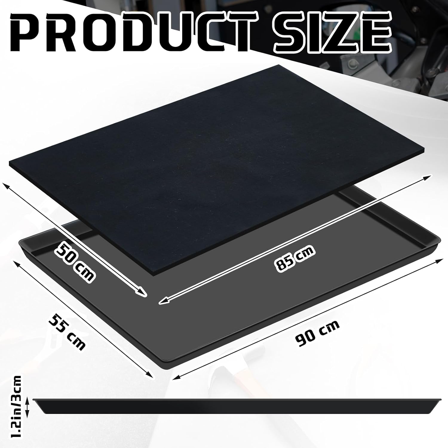 Features: The oil drain drip pan and square no splatter pad are designed with the stackable feature for easy and space saving storage. This design ensures that your workspace remains organized when the pans are not in use, facilitating enhanced productivity and a safer work environment. The car oil tray features raised edges to contain liquid effectively, preventing spillages. Its versatility makes them applicable in various occasions such as automotive repairs, machinery maintenance and more, or applied to cars, mini refrigerators, machinery, and even pet supplies, showcasing their wide usability range. Specifications: Material: Oil drain drip pan: PPSquare no splatter pad: feltColor: blackSize: Oil drain drip pan: about 35 x 22 inches/ 90 x 55 cmSquare no splatter pad: about 20 x 33 inches/ 50 x 85 cm, about 0.12 inch/ 3 mm in thicknessPackage includes: 1 x Oil drain drip pan1 x Square no splatter padNotes: Manual measurement, please allow slight errors on size. The color may exist a slight difference due to different screen displays.