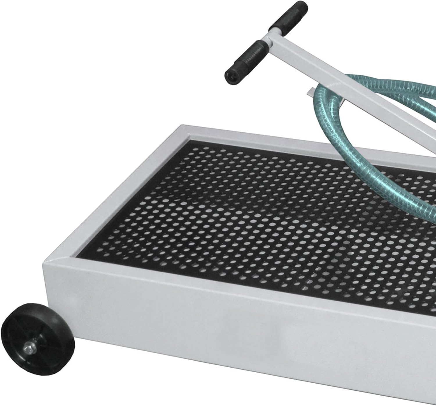 Changing your own car's oil can save you tons of money, but the task can be undeniably messy. With the Shop Tuff Steel Oil Drain Pump, you'll be able to prevent any unnecessary messes for an all-around smooth and efficient oil changing experience. This low-profile automobile maintenance accessory is perfect for low-profile oil applications. It features a 15-gallon capacity and is perfect for large draining jobs. It has a rotary hand pump and a 0.75-inch x 8-foot evacuation hose that quickly drains oil, antifreeze, and other fluids at 0.2 liters per hand revolution. Its durable all-steel construction and powder-coat finish give you a durable and long-lasting product. With the added (2) front 3-inch swivel caster wheels and (2) rear 5-inch wheels, you'll get unbeatable portability in the shop. For added safety, its expanded metal cover will protect you from unwanted oil splash while draining. Enjoying being your own mechanic with the Steel Oil Drain Pump by Shop Tuff.