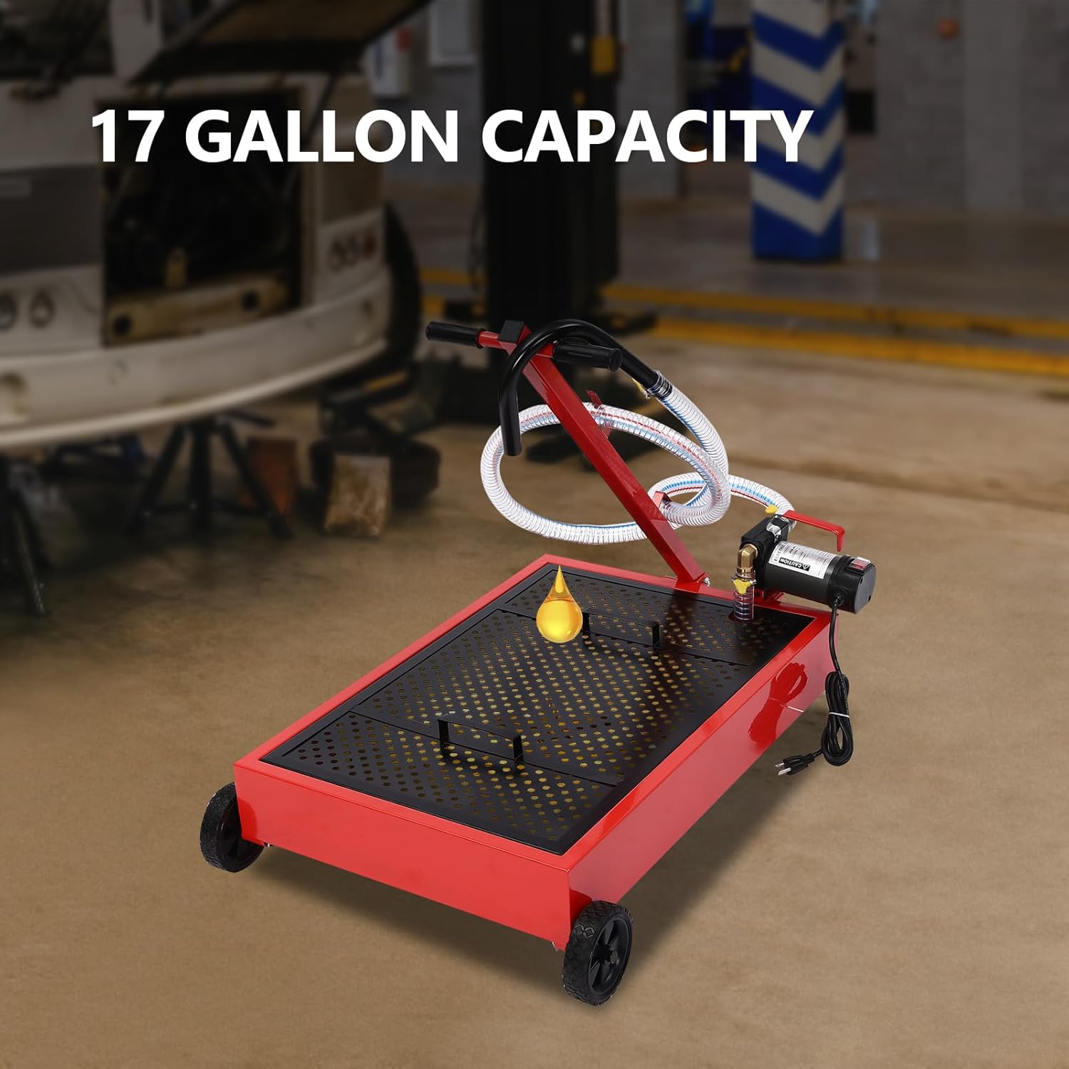 SpecificationsColor: Red, BlackMaterial: SteelProcess: Electrostatic SprayingAssembly Required: YesPlug Type: US StandardCapacity: 64.35L/17GalPump Flow Rate: 40L/min/10.57gal/minPump Rated Voltage: 110VPump Rated Current: 1.1APump Rated Power: 120WPump Speed Range: 2800r/minHandle Rotatable Angle: 0-145°Hole Diameter: 10mm/0.39inchSoft Pipe Length: 2.44m/8ftPower Cord Length: 1.8m/5.9ftTank Size: 81.1x53x11.18cm/31.93x20.87x4.4inchHandle Size: 75x3cm/29.53x1.18inchWheel Size: 12.7cm/5inch, 6.35cm/2.5inchPackaging Size: 85x58x20cm/33.46x22.83x7.87inchGross Weight: 15kg/33lbsPackage Included1xOil Drain Pan1xElectric Oil Pump2xLarge Wheels2xUniversal Casters1x8ft Soft Pipe1xEnglish ManualOther Needed Accessories Notes1.Please check the size carefully before ordering.2.Please read the operating manual and product label carefully before use.
