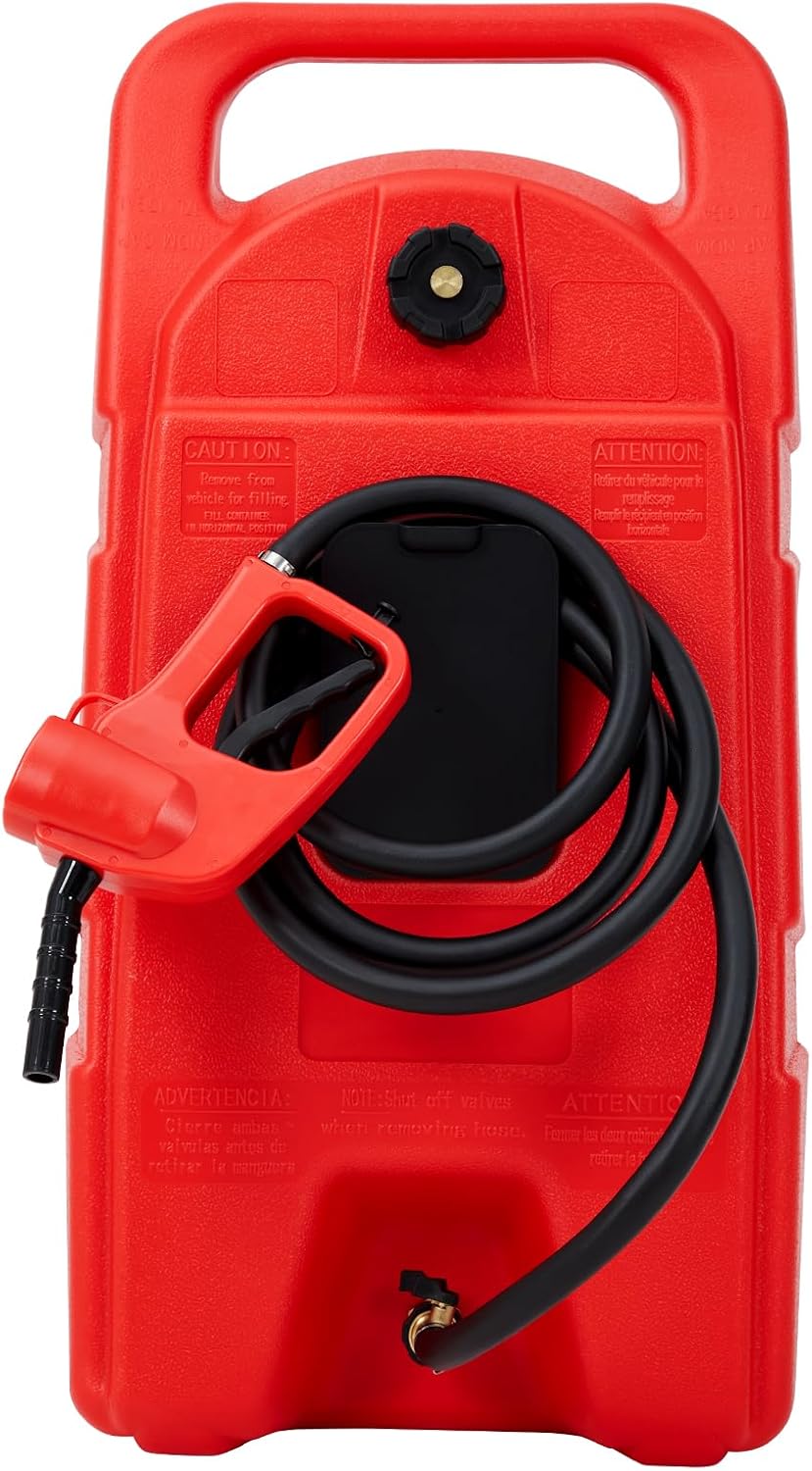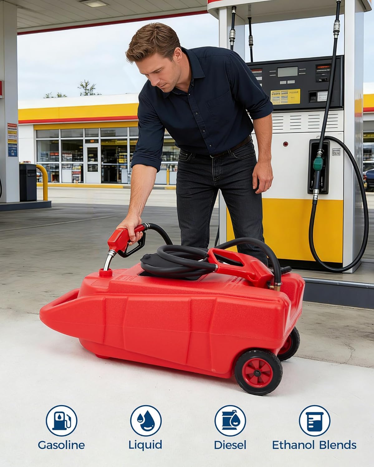 15-Gallon Heavy-Duty Gas Can with Manual Pump & 10FT Hose – Reliable Fuel Storage & Transfer SolutionEngineered for Rugged Outdoor Use: Made from industrial-grade HDPE, this fuel caddy resists dents, corrosion, and UV damage. It performs reliably in extreme temperatures (-30°F to 120°F), making it ideal for outdoor power equipment, generators, and urgent fuel storage.Dual Safety System: Features brass shut-off valves at both the tank and hose, child-resistant twist caps, vapor-sealed gaskets, and an anti-static, flame-retardant design to prevent leaks and spills, ensuring safe usage and transport.Effortless Fuel Transfer: Equipped with a manual hand pump and a 10FT reinforced hose with a 360° rotating nozzle. force current mode (2.5GPM) and manual siphon pump (2GPM) allow fast, controlled refueling, whether elevated or at ground level.Portable & Easy to Move: Heavy-duty 8" wheels, collapsible tow handle, and ergonomic side/top grips let you transport fuel across gravel, grass, or rough terrain. The lightweight build is 40% lighter than steel drums—perfect for trucks, boats, RVs, tractors, and off-grid needs.Multi-Fuel Compatibility & Smart Design: Safely stores gasoline, fuel oil, kerosene, or biofuel oil. Visible gallon/liter markers, a built-in tool tray for small accessories, and stackable shape help you manage fuel for lawn mowers, ATVs, snow blowers, and more.Applications: Use as a reliable backup for home generators, marine and RV travel, job sites, landscaping, and urgent preparedness. Designed to meet the highest standards for outdoor electric tool accessories and portable fuel storage.