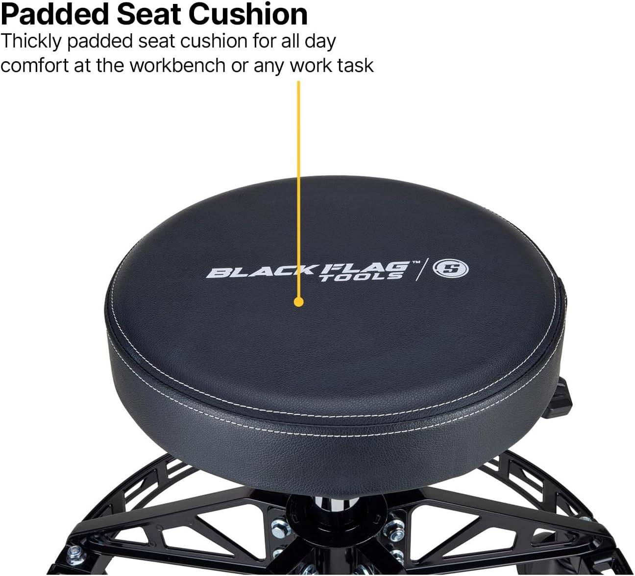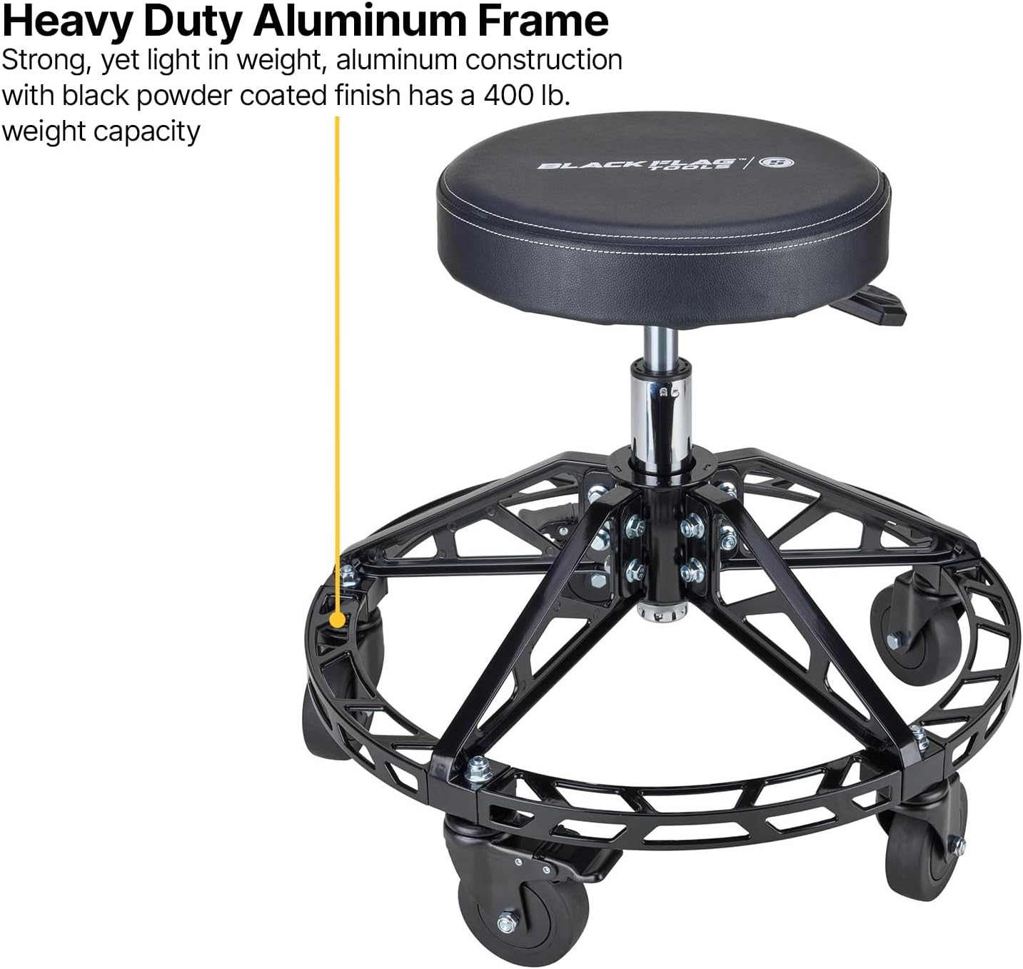 Mechanic stool pneumatically adjusts from 20.50 inches to 25.50 inches in height. Perfect and comfortable height for shop repair work needs. Five 4-inch casters (two locking) provide a stable platform on any hard surface. 23.50-inch diameter aluminum base with five aluminum upper supports for maximum strength. Aluminum base fCompatible with Rame sits 6.75 inches off the ground and doubles as a foot rest. The Black Flag shop stool with wheels feature a 400 lb. maximum working capacity. Black powder coat finish on all aluminum fCompatible with Rame parts. 14.00” round seat cushion (3” thick for comfort) Garage stool rotates 360 degrees for comfort and accessibility. Ships unassembled and includes fasteners and tools to assemble. Step Up Your Shop Seating With the Black Flag Rolling Shop Stool Just about any upgrade or repair on your ride will be handled better using a seated work position, especially those projects that can take up your whole afternoon. You can save your back when working on things like headlights or taillights, door panels, or exterior trim work by being seated versus kneeling or bending over. Even with cushioned work mats, kneeling for long lengths of time can be bad on those knees. A basic bar stool or repurposed office chair usually isn’t the right seat to use in these instances, and who wants a ratty hand-me-down garage chair taking away from the visual appeal of your professional workbench and storage cabinets you have in your shop? Our Black Flag Tools adjustable rolling shop stool is the perfect solution, providing a stable and comfortable seating position for your work projects. High Strength Aluminum Construction With 400 Lb. Maximum Working Capacity Built with a high grade black powder coated aluminum fCompatible with Rame, our mechanic stool with wheels features a circular base that is 23.50 inches in diameter. The garage stool base utilizes five upright supports to allow the stool’s 400 lb