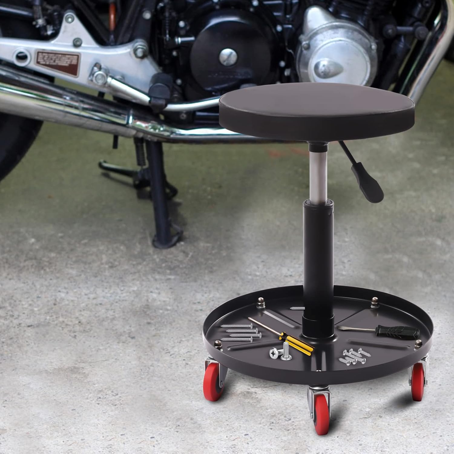 Description Do you want to be able to sit to work at any time whether you're cleaning and fixing your car, doing long hours of assembly or organizing files in the office? It is time to get comfortable with this pneumatic mechanic roller seat from us. It features thick pearl cotton padding and adjustable height and orientation to make those long days in the shop less unendurable for you. So What are you still hesitating for? Hurry up and take it home! Details Hand Lever: There is a simple hand lever under the seat, through which you can easily pneumatic lift height adjustment in the height range of 17.3 to 22.1inch. PU Surface: The surface of the seat is wrapped with high-quality PU that has good water proof performance, so you can wipe it with a soft cloth to keep it neat and tidy. Application It is suitable for indoor various car repair/maintenance stores, offices and various workplaces. Specification Material: Steel +PU Color: Black Style: Adjustable Shape: Round Storage Tray Diameter: 38cm/14.96in Adjustable Height Range: 44-56cm/17.3-22.1in Max. Bearing: 136.08kg/300lbs Casters: 6.35cm/2.5in Package Size: 40*40*12cm/15.75*15.75*4.72in Diameter of Seat Surface:30cm/11.8in Thickness of Seat Surface: 4cm/2in Gross Weight: 4.9kg/10.8lbs Net Weight: 4.6kg/10.14lbs Package Included 1*Seat 1*Storage Tray 1*Hand Lever 1*Support Bar All Accessories for Assembly