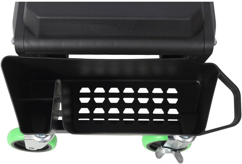SpecificationsMaterial: Steel Frame + Plastic SeatColor Options: Gray, GreenLoad Capacity: 330 lbsProduct Dimensions: 21.25"L × 15.75"W × 15"HProduct Weight: 14 lbsWheels: 4" industrial-grade swivel casters (2 lockable)Storage: 2 removable trays + 1 drawerPackage Contents1 × Rolling Garage Stool2 × Removable Side Trays1 × Storage Drawer4 × 4" Swivel Casters (2 with brakes)1 × Assembly Instructions
