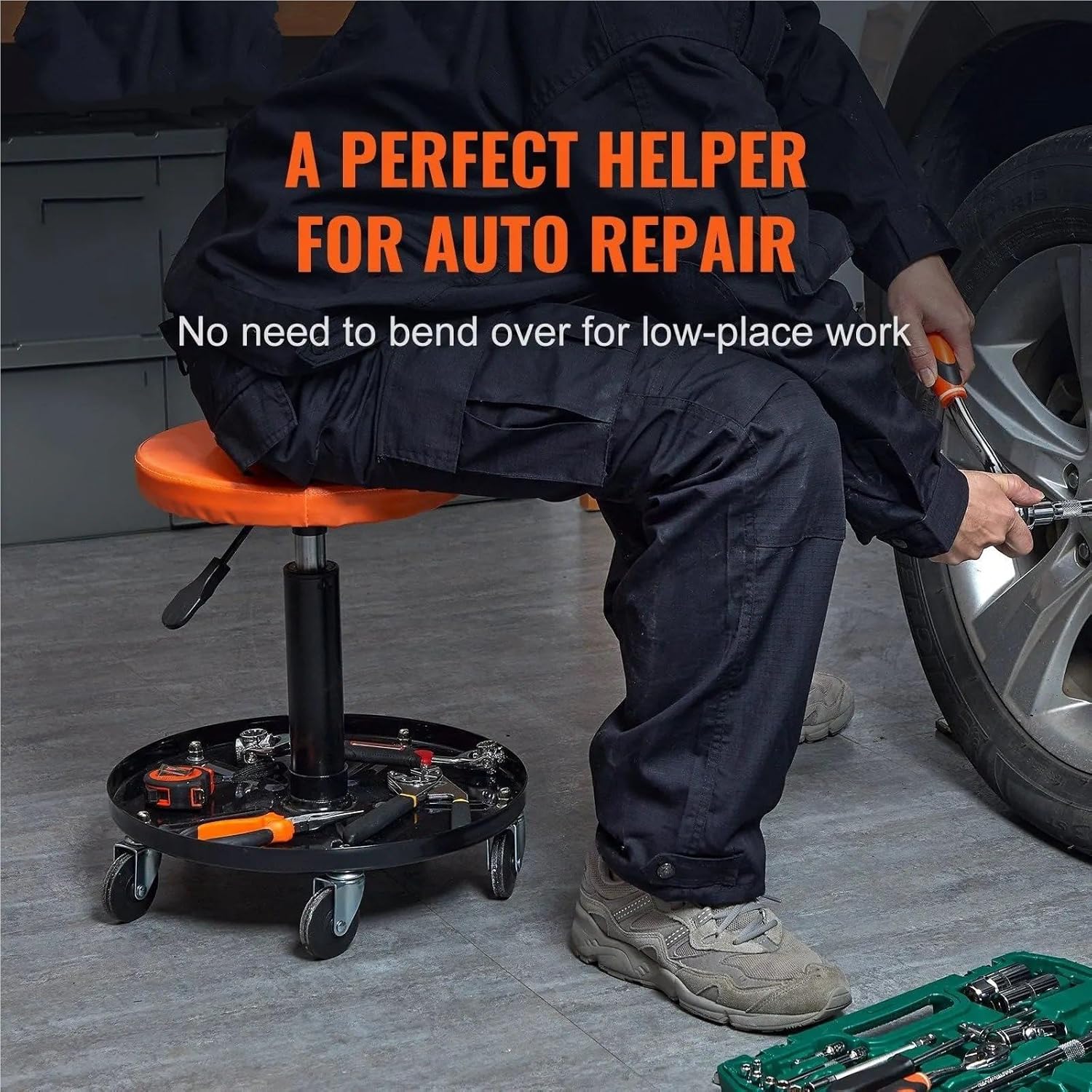 Dear customers, hello! Our store focuses on fashion and quality. We provide a wide variety of products to meet different needs. We insist on winning with quality and strictly control product details. We provide considerate service and professional customer service to respond at any time. We create an ideal shopping space for every customer and look forward to your visit. We are at your service 24 hours a day. Save yourself the trouble, and stop bending over! Adjusting the height to a suitable position while working has never been easier! 250 LBS Capacity: Adopt high-quality pneumatic cylinder, which has a strong bearing capacity and is not easy to deform after long use. The seat is firm, and the casters are fixed firmly with locknuts and thread glue. Put your worries aside and have a seat. The center of gravity is stable, making it difficult to tilt and preventing falls. Organize Your Space: The tool tray is made of iron, making it resistant to the impact of sharp tools; it features compression and wear resistance. With the large steel tool tray, you can organize your equipment in order and keep them within reach. Put a storage compartment inside the footrest! Move with Ease: Comes with everything you need! Equipped with 5 pcs 2.5"/6.35 cm 360° universal casters, the workshop stool can be flexibly steered even on complex surfaces. Ball-bearing PP casters feature a compression mechanism and are wear-resistant. Smooth movement on different surfaces. Broad Applications: The wide padded seat allows you to work longer while sitting for hours. The garage stool is perfect for repairing or cleaning vehicles, furniture, and other low projects. Lightweight design allows you to use it anywhere you need, such as garages, roadsides, homes, etc. Work an