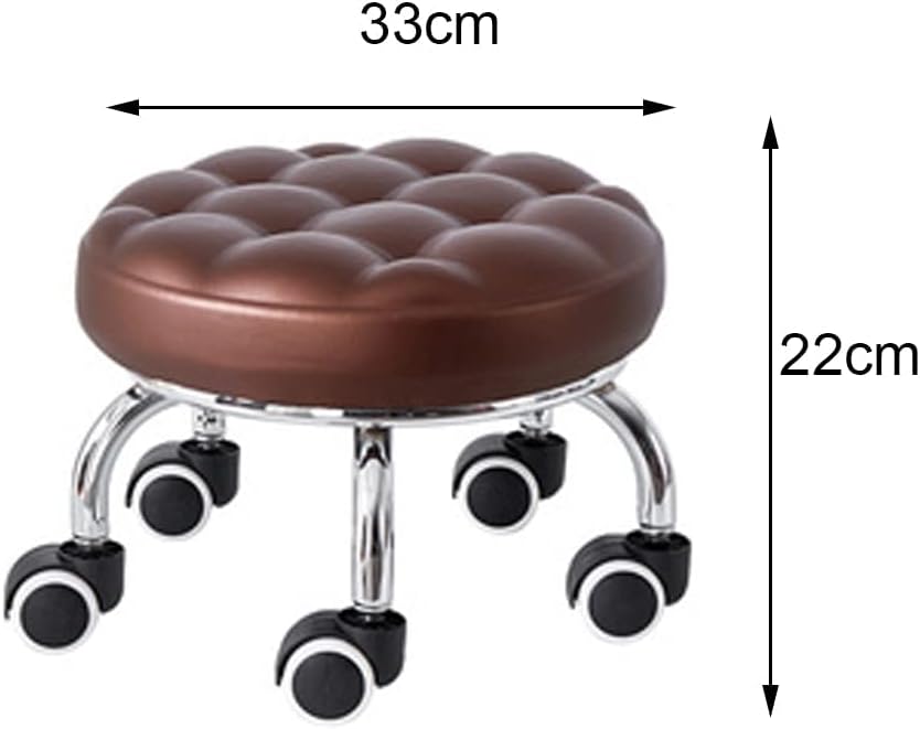 PU Leather Swivel Round Roller Stool No Damage to the Floor, No Extra NoiseSuitable for homeliving room decoration, the small won't take up more space, if you have several stools, they can be stacked in the corner.The seat cushion is wrapped in pu leather, which is waterproof and breathable, and easy to clean.The roller rotates 360 degrees, silent roller, easy to move. Specification:Type: Low Rolling Stool with WheelsMaterial: iron alloyUpholstery Material: LeatherColor: black, brownHeight: 22cmSeat cushion diameter: 33cm Our task benches are versatile: camping, working floor tile joints, grooming nail salons, pedicures, child care, or doing some low jobs that require sitting in a lower position, our task benches will be the best choice.