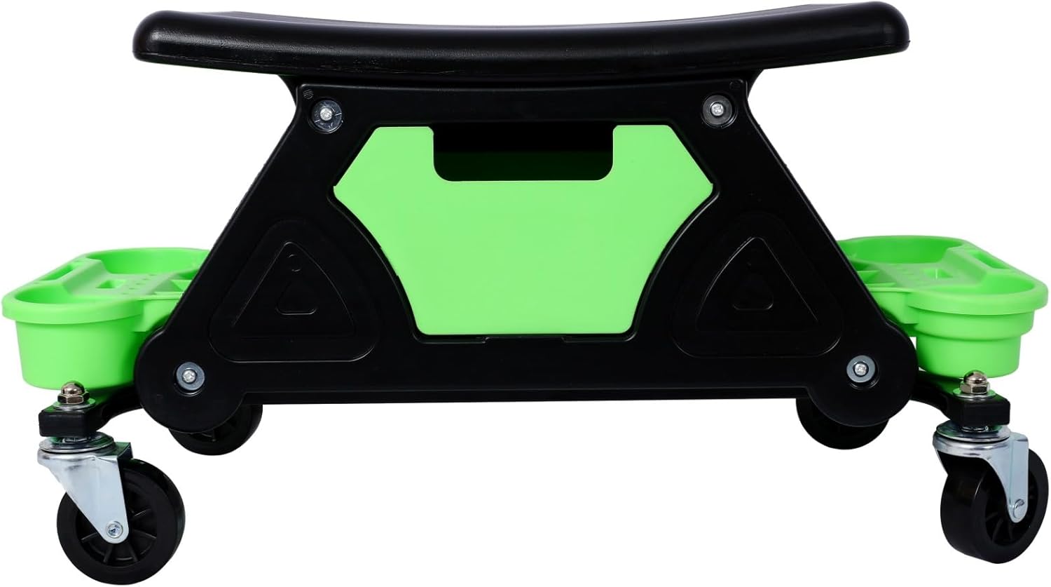 This heavy-duty mechanic roller seat features five 3-inch casters with brakes and three tool trays for organized mobility. The ergonomic seat supports 300lbs, making garage repairs and automotive maintenance more comfortable and efficient.