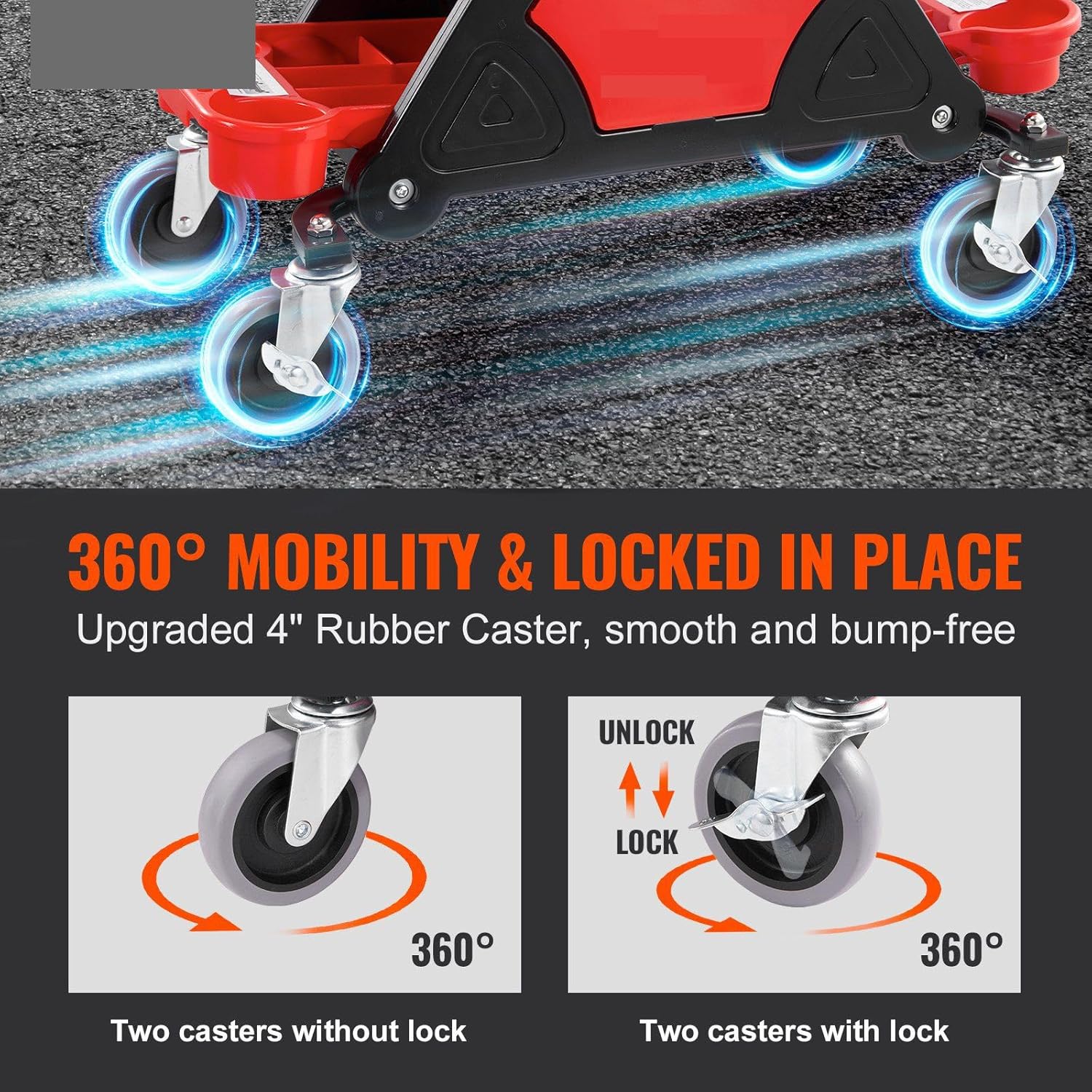 Upgrade your maintenance experience with our Mechanics Roller Seat today.This roller seat provides smooth gliding motion with its 4-inch universal rubber casters and 360° rotation capability. The seat's thick sponge cushion and ergonomic design provide maximum comfort, while its three storage trays keep your tools organized and within reach. Our mechanics roller seat with 4-inch rubber casters and two brake casters are included, effortlessly secure your desired position. These larger diameter casters allow smooth navigation over bumps and uneven surfaces.Say goodbye to discomfort during long work hours with our mechanics roller seat. The cushion reduces strain on your body and the curved design provides exceptional support. Its easy-to-clean surface, while its ergonomic height of 15.4 inches allows for efficient work without bending over.Boost your productivity by keeping your tools and items neatly organized. Our mechanics roller seat boasts three storage trays designed for maximum efficiency. The large tray provides ample storage for various tools, allowing you to focus on your maintenance work without running back and forth.You can follow the label on the desk to install the tool tray. Insert the tray at an angle and press down to secure it to the beam. Press the tray inward and downward until it snaps into the metal frame at the bottom