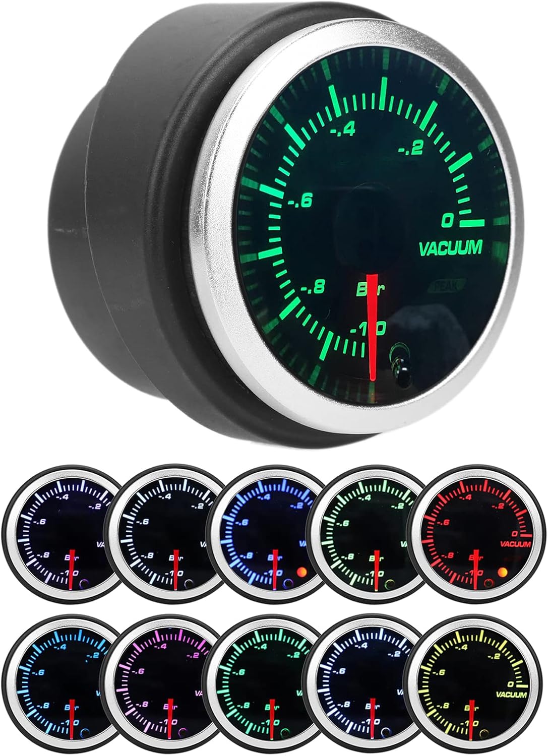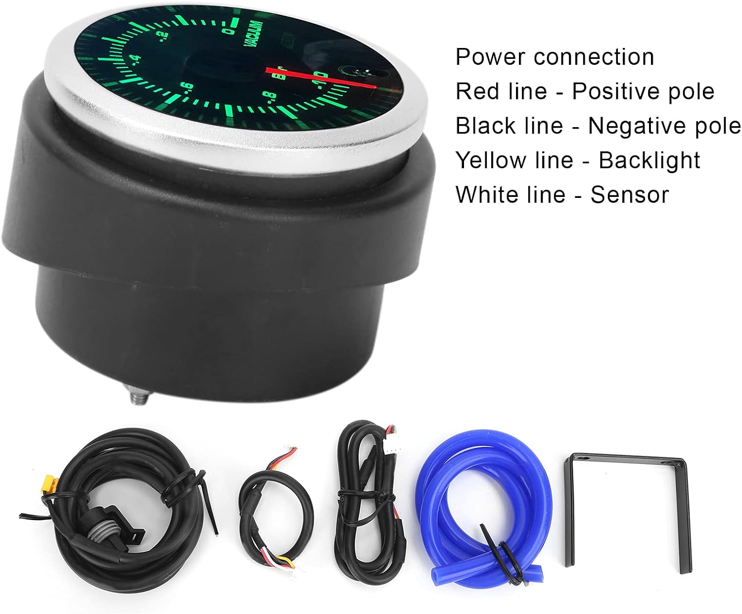 Item Type: Vacuum GaugeMaterial: ABSIndication Range: -1-0 barInstallation Size: 2in or 52mmBackground Color: 10 ColorsDisplay Type: Pointer IndicationWorking Voltage: 12VFunction: Designed to measure and display the engine compression level of your car or truckApplication: Universal for 12V gasoline vehiclesPackage List:1 x Vacuum Gauge1 x Sensor1 x Power Harness2 x Sensor Wiring Harness1 x Blue Hose1 x 3-Way Adapter1 x Mounting Bracket2 x Screw2 x Nut6 x Tie1 x Manual