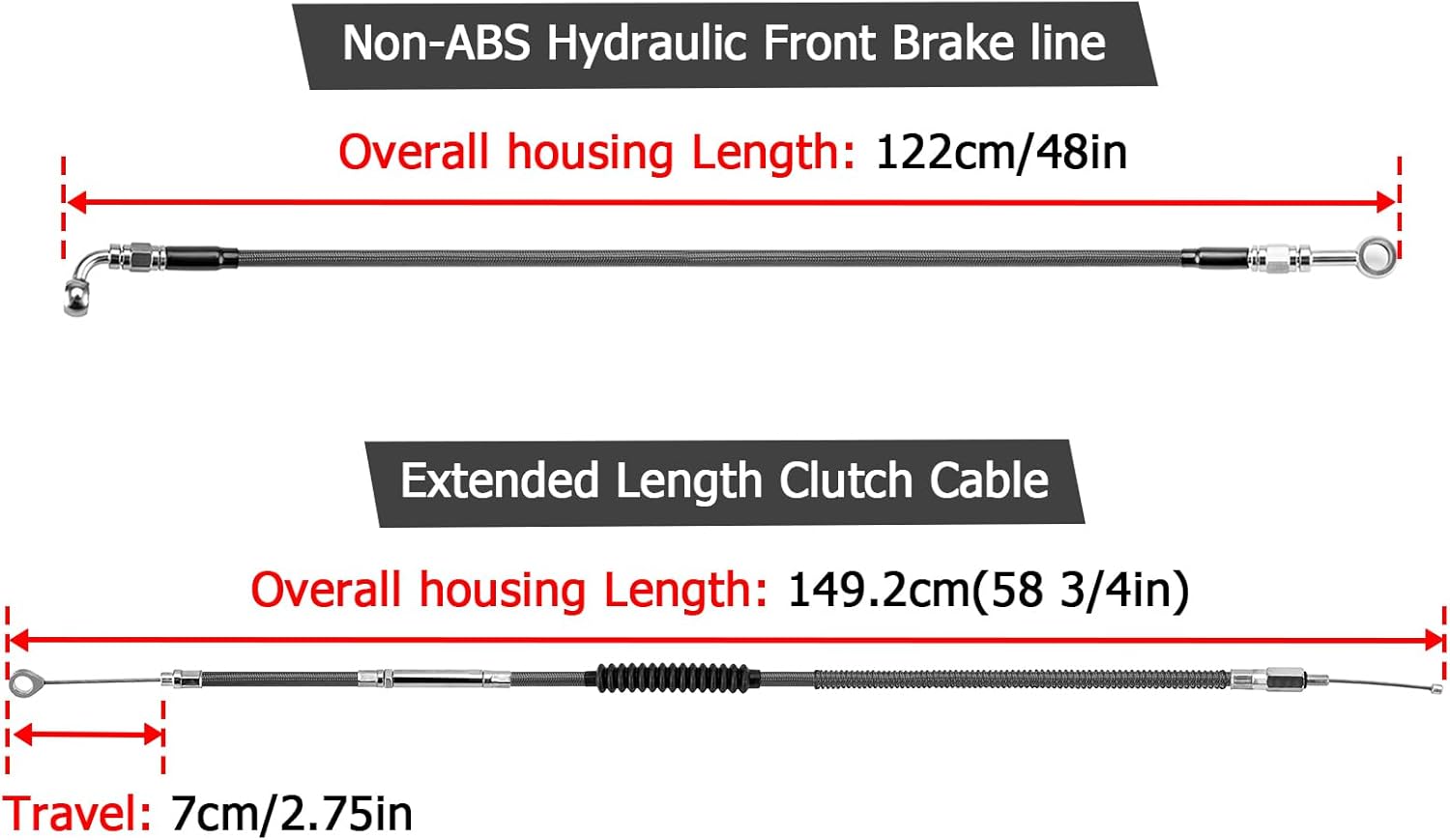 Fitment List Compatible with Harley Sportster Non-ABS 1992-2003 Fit 12"-14"Handlebar (Non-ABS) Compatible with Sportster - XLH 883 1992-2003 Compatible with Sportster Custom - XL 883C 1999-2003 Compatible with Sportster Deluxe - XLH 883 1992-1995 Compatible with Sportster Hugger - XLH 883 1988-2003 Compatible with Sportster - XLH 1200 1988-2003 Compatible with Sportster Custom XL1200C 1996-2003 Total Specifications Item: Extended Length Hand Control CAN Wire, Non-ABS Hydraulic Front Brake Line and Clutch Cable Kit Used On:12" -14" Handlebar(Non-ABS) Color: Black Inner Tube Material Brake Line Inner Tube Material:Teflon(PTFE, Temperature Resistance From -70°C To 260°C) Clutch Cable Inner Tube Material: Steel Inner Conduit, Inner PE Liner Outer Tube Material:Polished Stainless Steel Preparation Outer Transparent Tube Material: PVC Hand Control Extension Can Wire Matching The Factory Colors Overall Length:14"(355.6mm) Extended Length Clutch Cable Specifications Overall Housing Length: 58 3/4"(1492mm) Travel Length :2.75"(69.85 mm) Replace For Clutch Cable Number :#3861986A, 3866300, 38699-04 Non-ABS Hydraulic Front Brake Line Specifications Overall Housing Length:48"(1220mm) Replace For Hydraulic Brake Line Number :# 48980-10, 45250-98B, 45250-08, 45291-06, 45291-08, 45121-96A
