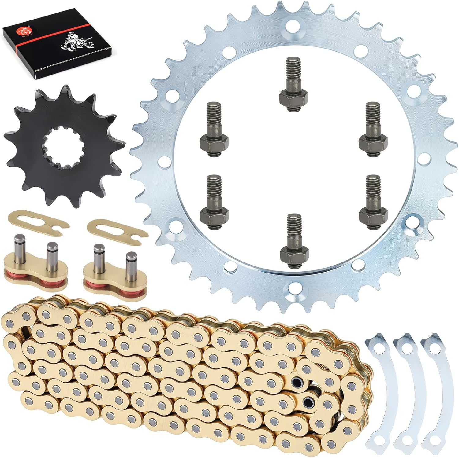 Package: 520V-X 92Link Drive Chain x1 Drive Chain Sprocket 40T x1 Drive Chain Sprocket 13T x1 Washer x3 Stud Bolt x6 Manufacturer Part: 94582-02092-00 2XJ-25440-21-00 2XJ-25440-20-00 9383E-13216-00 2XJ-25412-00-00 90116-08507-00 This Accessories fits the following models: For Yamaha Raptor 660 YFM660R 2001-2005