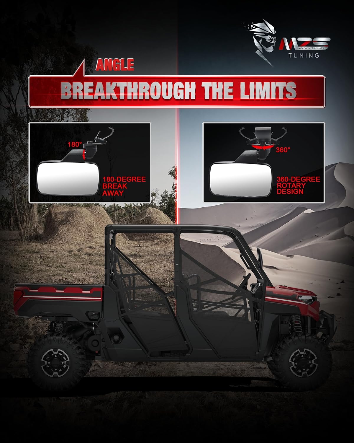 Specification: Material: ABS Injection Molded Housing & Billet Bracket Lens: HD Convex Shatter-Proof Tempered Glass Size: 8.07(L) X 4.53(W) Inch UTV Mirrors Weight: 2.51 Pounds Package Includes: 2 x UTV Side View Mirrors 2 X Mounting Clamp Features: Consists of ABS, Billet Bracket and HD Tempered Glass, it's more high-impact resistance, corrosion resistance and enduring Extra-wide convex mirror for the wider viewing area. Let the driver to see the vehicles and conditions behind him to remove blind spots The joint ball can be adjusted 360 degrees to fit your need, and it will stay in the place when you tighten the screw When the UTV side mirrors hits trees or other objects, it can be folded backwards to reduce the risk of damage Fitment: Ranger 500 2017-2026 Ranger 570 Serie Models 2016-2025 Ranger XP 900/ Crew 2013-2019 Ranger 1000/ XP 2017-2026 Ranger Crew 1000/ XP 2017-2026 Ranger Diesel 2016-2018 Ranger 6x6 800 2011-2017 Ranger ETX 2015- 2016 Ranger EV 2015-2023 Ranger LI-ION 2016-2018 General 1000/ XP 2016-2026 General 4 1000/ XP 2017-2026 Defender HD5/ HD7/ HD8/ HD9/ HD10 2016-2026 Maverick Trail/ Maverick Sport 2018-2026 Commander 2021-2026 UFORCE 500/ 600 /1000 2018-2026 800SX 2020-2025 It Only for Pro-fit cage, will not fit windshield, full door and round roll bar More for detailed models, please refer to the vehicle fitment list