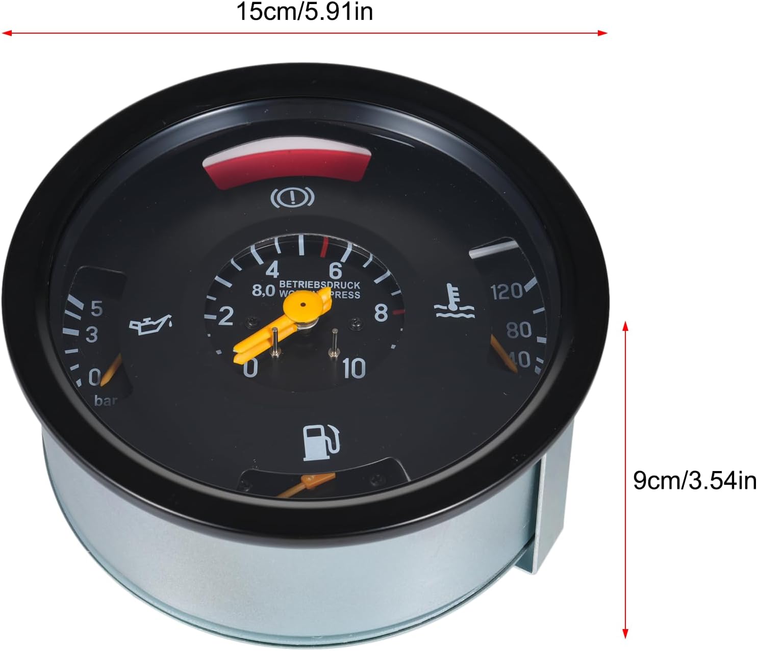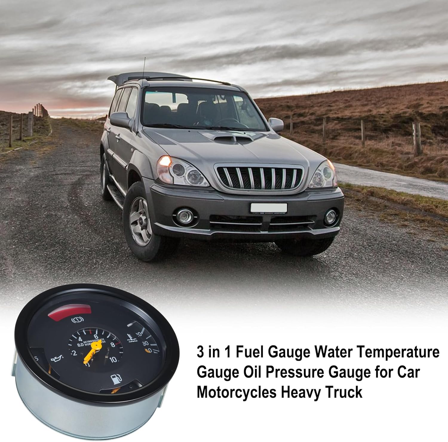 Specifications: Item: 3 in 1 Fuel Gauge Main Color: Black Material: Stainless Steel Size: 15*15*9cm/5.91*5.91*3.54inch Package Size: 19*18*13cm Package Weight: 930gPackage List: 1* 3 in 1 Fuel Gauge+Oil Pressure Gauge+Water Temperature Gauge