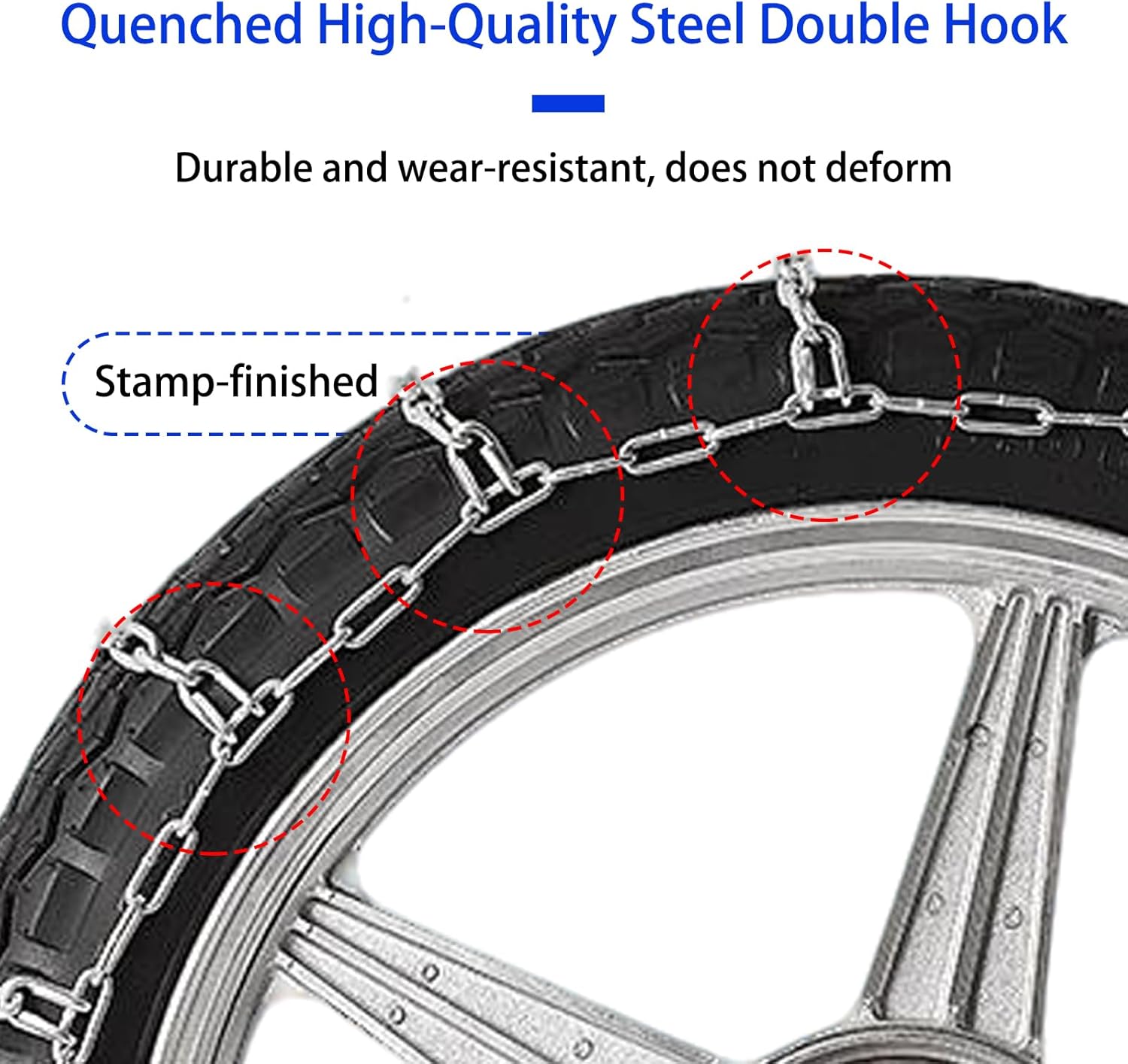 Ride safely and confidently through winter and muddy terrain with our Heavy-Duty Motorcycle Tire Chains.Engineered with reinforced steel and a dense anti-skid structure, these chains deliver superior traction and stability on snow, ice, and slippery roads. The thickened cross chains provide maximum road contact, preventing tire slip and improving control during braking and cornering.Designed for motorcycles, electric scooters, and two-wheel vehicles, they feature an adjustable universal fit that makes installation quick and easy—no tools needed. Whether you’re commuting in snowy weather, tackling mountain trails, or riding through mud, these chains will keep your wheels steady and your journey safe.Enjoy strong grip, long-lasting durability, and all-season reliabilitywith this must-have winter safety accessory for every rider.