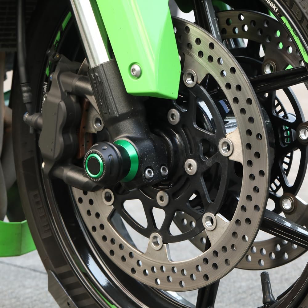 Note: Before ordering, make sure this part is compatible with your bike. Fitment : NINJA ZX10R 2011 - 2024 2025 Material: CNC Aluminum 6061 Anodized. Made in China Function: Front Axle Sliders are customized to the specific axle length of the motorcycle. In the event of a collision, the front forks, calipers and discs are kept off the ground to avoid damage to these core components, protecting both the motorcycle and the rider.