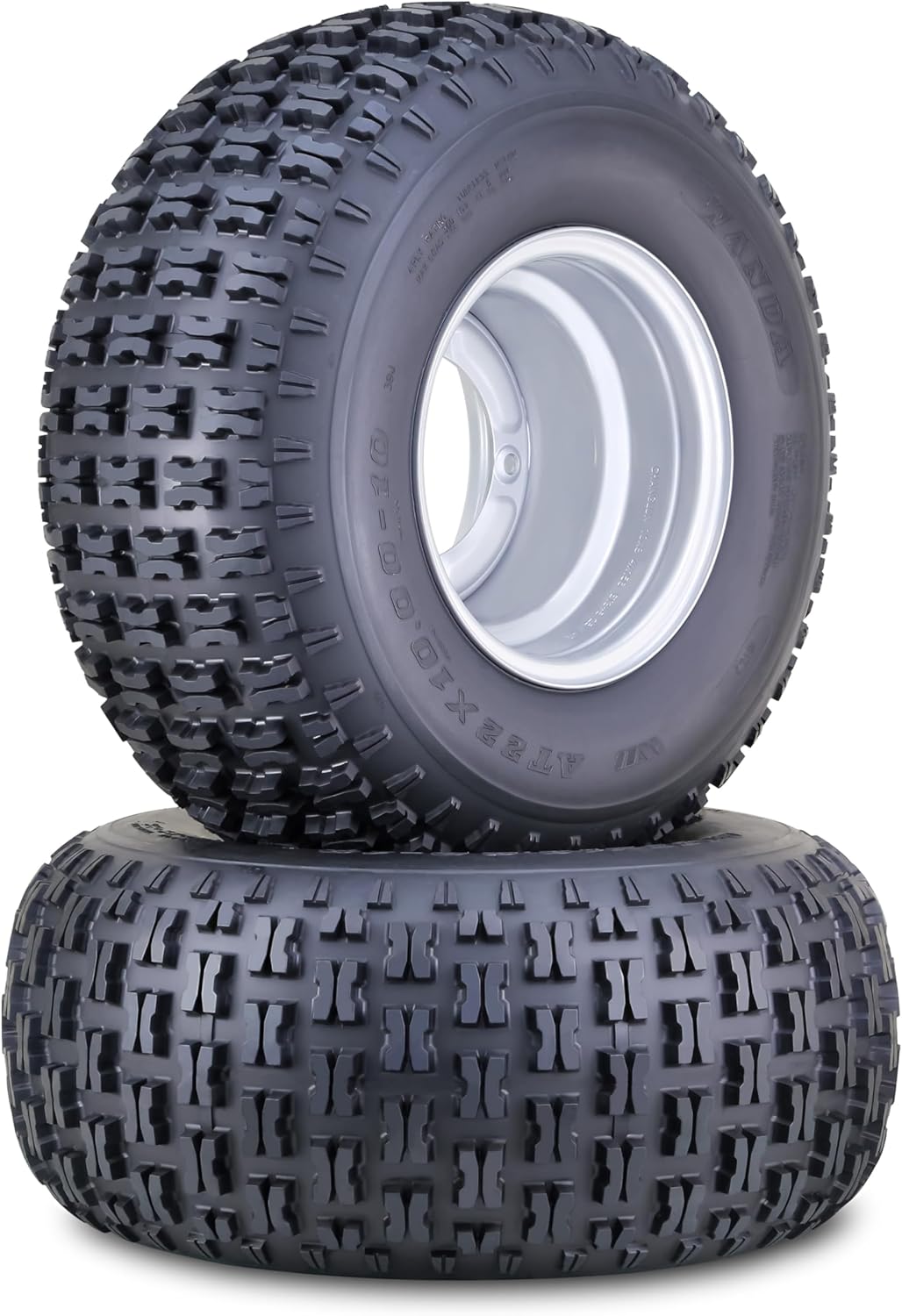 Dynamic tread pattern provides exceptional traction. Enhanced lug depth brings better brake control. Heavy 4 ply rated nylon construction resists punctures and abrasions. WHEEL DETAIL: 4 Lugs on 110mm bolt pattern, center hole: 90mm, bolt hole: 10.5mm, offset: 3+6, style: SilverTire SpecificationsTire Size: 20X10-9Brand: WANDATread Pattern: P336Ply Rated: 4Tread Depth: 0.59Rim Width: 9Max Load: 260lbs@5psiLoad Index: 34Speed Rating: JPlease note: fitment guide is for reference only and does not guarantee the tire will fit your specific model. Please check your owner's manual to ensure proper fitment.