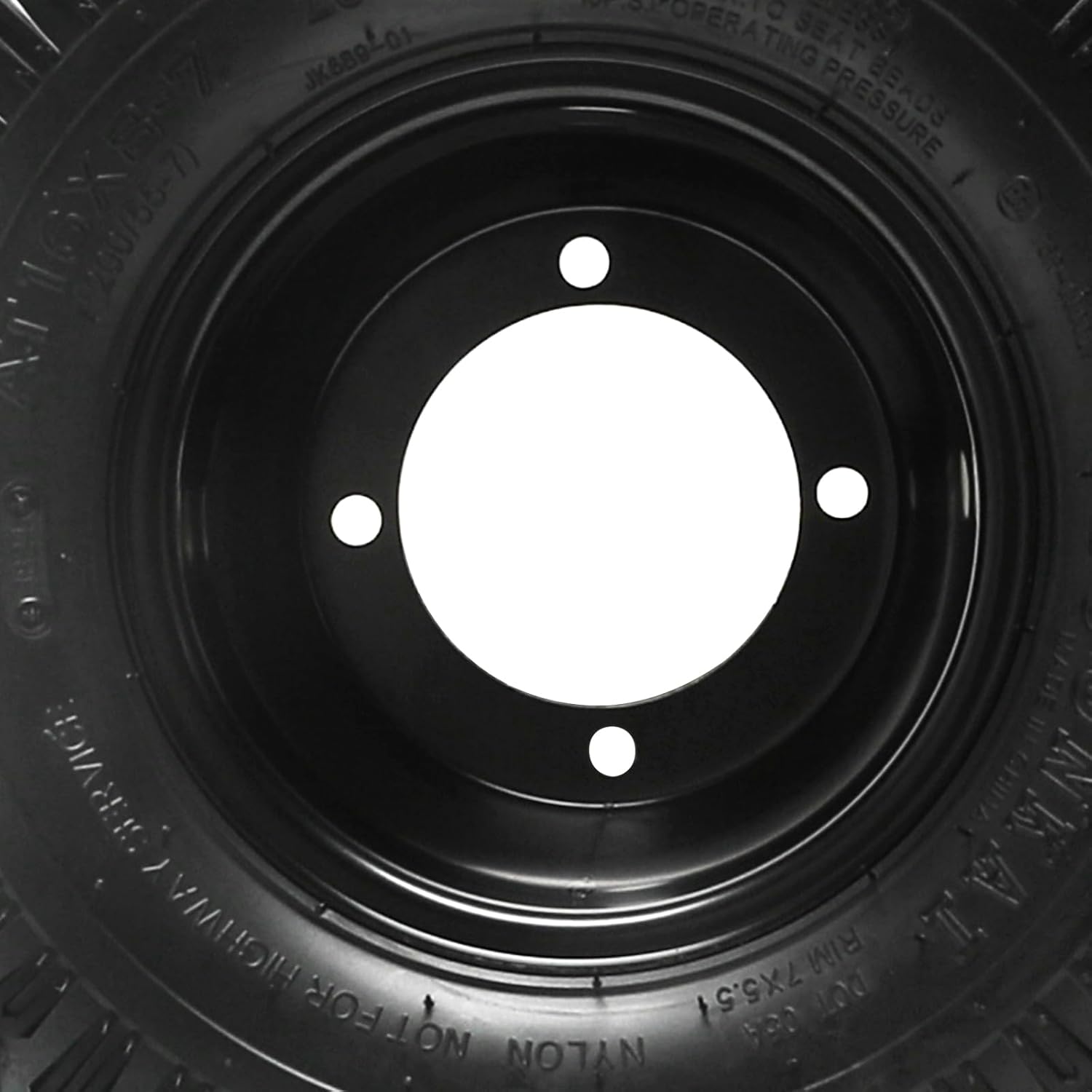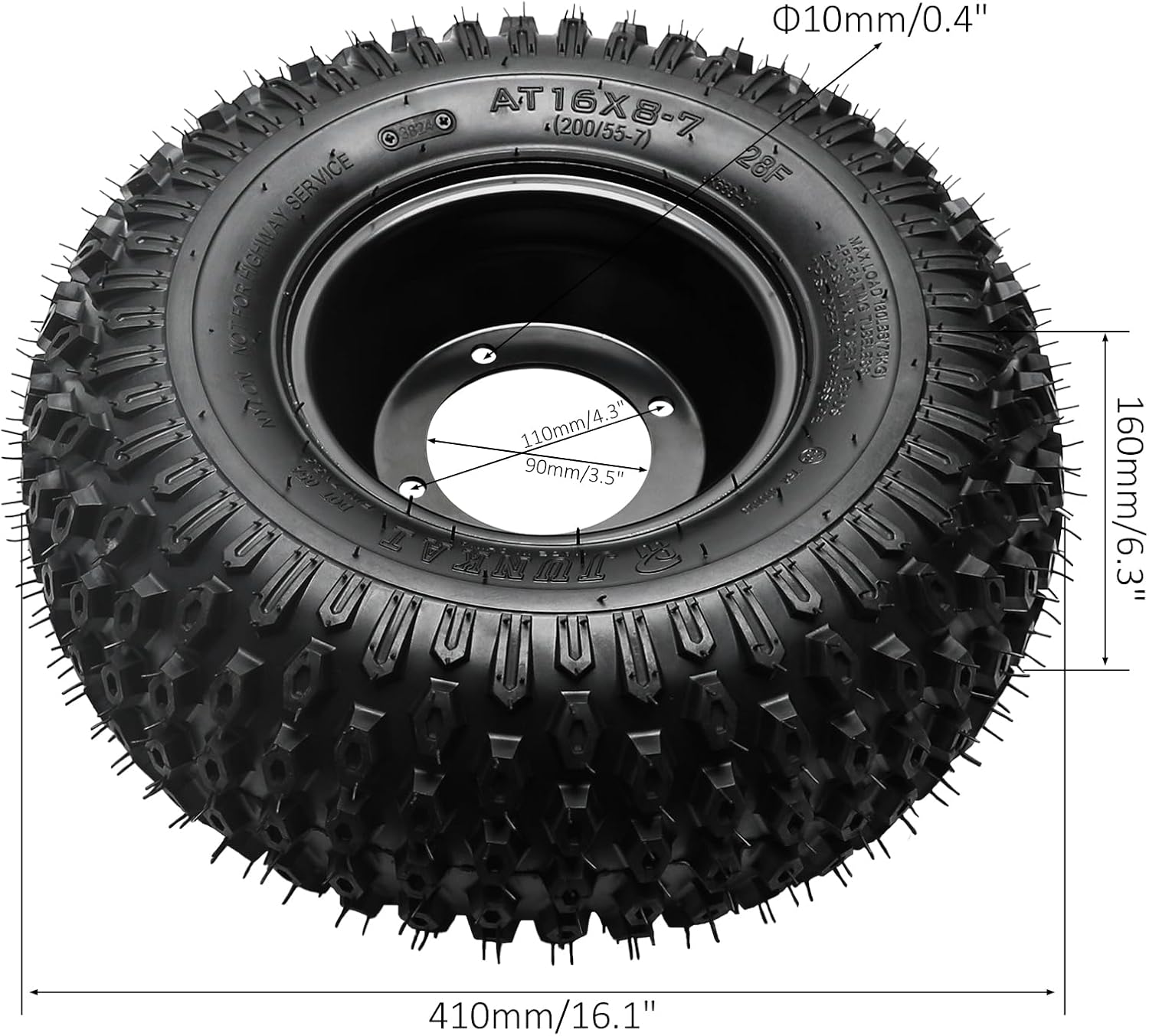 Product Features & SpecificationsTire Size: 16x8-7 / 16x8.00-7 / 200/55-7Rim Size: 7 InchesBolt Pattern: 4-Stud, 110mm (4.33") SpacingTire Construction: 4-Ply Rated (4PR) Nylon, TubelessRim Model: FY-002-012 with Fire Pattern DesignRim Type: 5.0 AT RimMounting Style: 4-Hole DesignIntended Use: Off-Road/Recreational Only (Not for Highway Use)Package Quantity: 2 Complete Wheel & Tire AssembliesKey FeaturesComplete 4-Wheel Set: Includes four pre-mounted tire and rim assemblies for full vehicle upgradeHeavy-Duty 4-Ply Construction: 4PR nylon tires provide superior puncture resistance versus standard 2-ply optionsVersatile All-Terrain Design: Suitable for various outdoor conditions and recreational applicationsTubeless Technology: Eliminates inner tubes for easier maintenance and enhanced reliabilityUniversal 4-Stud Pattern: 110mm bolt spacing fits many ATV, UTV, and utility vehicle modelsReady-to-Roll Installation: Pre-assembled wheels mount directly to your vehicle's hubsCompatibilityVehicle & Equipment Applications:ATVs and Quad BikesUTVs and Side-by-SidesGo-Karts and Dune BuggiesLawn Mowers and Grounds Maintenance EquipmentMini Bikes and Small Utility VehiclesAgricultural and Industrial CartsRecreational Off-Road VehiclesImportant Notes:For off-road/recreational use only - NOT approved for highway or street useVerify your vehicle's bolt pattern matches 4-stud 110mm spacingConfirm axle/hub diameter compatibility with rim center holeEnsure adequate clearance for 16" tire diameter and 8" widthPackage Includes2 x Complete Wheel Assemblies (Each includes: 7-inch rim with pre-mounted 16x8-7 4PR tubeless all-terrain tire)