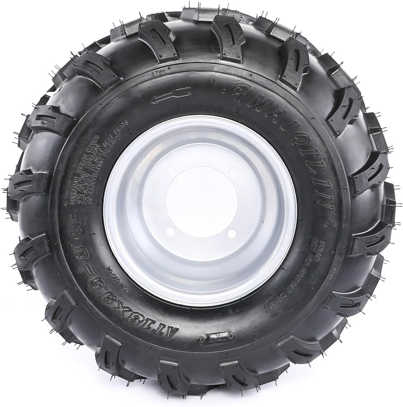 Product Features & SpecificationsTire Size: 18x9.50-8 / 18x9.5-8Rim Size: 8 InchesBolt Pattern: 4-Stud, 110mm (3 inches / 78mm) Center-to-CenterTire Construction: 4-Ply Rated (4PR) Nylon, TubelessTread: 4 Nylon, Sidewall: 2 NylonRim Type: 6.5 AT NylonOperating Pressure: 10 PSI (165 kPa)Max Load: 227 lbs (115 kg)Overall Height: ~18.5 inchesOverall Width: ~8.46 inchesPackage: Complete Tire & Wheel AssemblyKey FeaturesComplete Pre-Mounted Assembly: Tire comes mounted and balanced on the rim for immediate installationHeavy-Duty 4-Ply Construction: 4-ply nylon carcass provides excellent puncture resistance and durabilityTubeless Design: Eliminates the need for an inner tube, reducing maintenance and potential puncture issuesVersatile 4-Bolt Pattern: 4-lug rim with 110mm bolt spacing fits a wide variety of small vehiclesAll-Terrain Tread Pattern: Splay pattern design offers good traction on various surfacesSubstantial Size: 18.5" tall tire provides good ground clearance for off-road and utility useCompatibilityVehicle Applications:ATVs and Quad Bikes (125cc-250cc)Go-Karts and Dune BuggiesRiding Lawn Mowers and Garden TractorsGolf Carts and Utility VehiclesMini Bikes and Small 4-WheelersIndustrial and Turf CartsLight Agricultural EquipmentImportant Notes:FOR OFF-ROAD/UTILITY USE ONLY. Not DOT-approved for highway or street use.Verify your vehicle's bolt pattern matches 4-stud, 110mm (3") spacing.Confirm axle/hub diameter compatibility with the rim's center hole.Ensure adequate clearance for an 18.5" tall, 8.46" wide tire.Package IncludesComplete Wheel Assembly (8-inch rim with pre-mounted 18x9.50-8 tubeless tire)