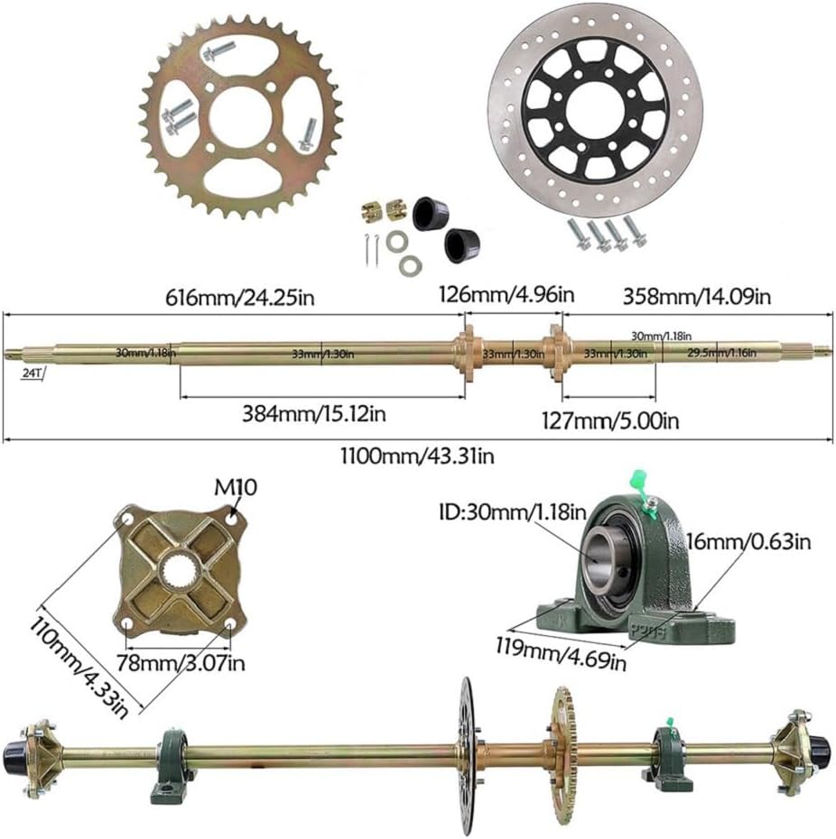 18x9.5-8 Four Wheeler Wheel: Condition: 100% Brand New Color: Black Material: Nylon Wheel Height: 470mm/18.5 inch Wheel Width: 215mm/8.46 inch Tire Size: 18x9.50-8 Bolt Holes: 4pcs Mounting Hole To Hole Distance: 78mm/3.07 inch Max Load: 253LBS/115kg 4PR Max Inflate: 24 P.S.I (165 kpa) Operating Pressure: 10 P.S.I Tread 4 Nylon Sidewall 2 Nylon Rim 6.5 AT Nylon Tubeless Splay Pattern Not for highway service Fitment: Universal for Universal for Scooter Go Kart Razor Pit Dirt Bike Pocket Rocket Monkey Trail Bike ATV UTV Drift Trike Golf Cart Quad Buggy Dune Moped Four Wheeler Tricycle Mobility Offroad Motorcycle Complete rear axle kit: Material: metal Color: gold Axle Overall length (from end to end): 1120mm (44") The thickest part of the axle is 33mm (1.3") Chain Sprocket: 530 37 Tooth 58mm(2.28") Brake Disc Rotor Diameter: 220mm(8.66") Spline teeth: 24T Complete Axle Kit Includes: 1 x Rear Axle kit, A Pair of pillow blocks, 1 x chain Sprocket, 1 x Brake Disc rotor, A Pair of 4 bolt wheel hubs Package includes: 4pcs 18x9.5-8 go kart wheel A full set of 44" Complete rear axle kit 1pc 530 120 Links Chain 1pc Rear Brake Caliper 2pcs 4 Stud Front Wheel Hubs 2pcs Front Steering Knuckle Spindles 2pcs M12 Swingarm Tie Rod End Ball Joint 2pcs Bolt Tie Rod End Ball Joiner 2pcs Disc Brake Rotor