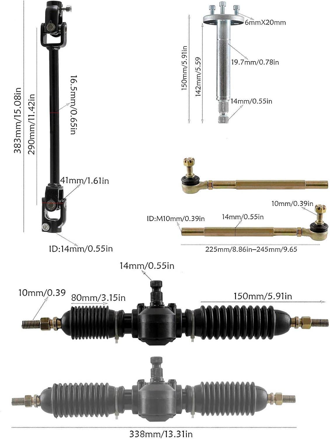 Axle overall length 32 inch, 1 in diameter and the thickest part of the axle is 1 3/16Replacement for go kart, ATV, Quad, Trikes, Golf CartsHigh-quality rubber atv wheelMounting hole to hole: 3.07in/78mmCentre Holes: 3.54in/90mm10mm boltsTire size is 16X8-7overall diameter is 16.73in/425mmsection width is 5.7in/145mmThe unique tread design of the tread is to increase friction, increase the adhesion of the wheels to the ground.It can adapt to dry, wet, rugged mountain a muddy, sandy road, and other harsh environments and climateSteering WheelOuter Diameter: 270mmCenter hole: 16mmMounting holes to hole: 35mm, hole size: 7mmDisc Brake RotorID 48mm 1.9inOD 130mm 5.1inThick 3mm 0.11inMounting Hole Size 7mm 0.3inThe suspension swing arm kit helps to reduce road noise and vibration, allowing you to enjoy a and controlled ride during turns and bumps.Front Suspension Shock Swing Arm Kit is made of high quality steel alloy, sturdy and wear resistant. the electronic coating on the increases the protective effect and extends the service life.
