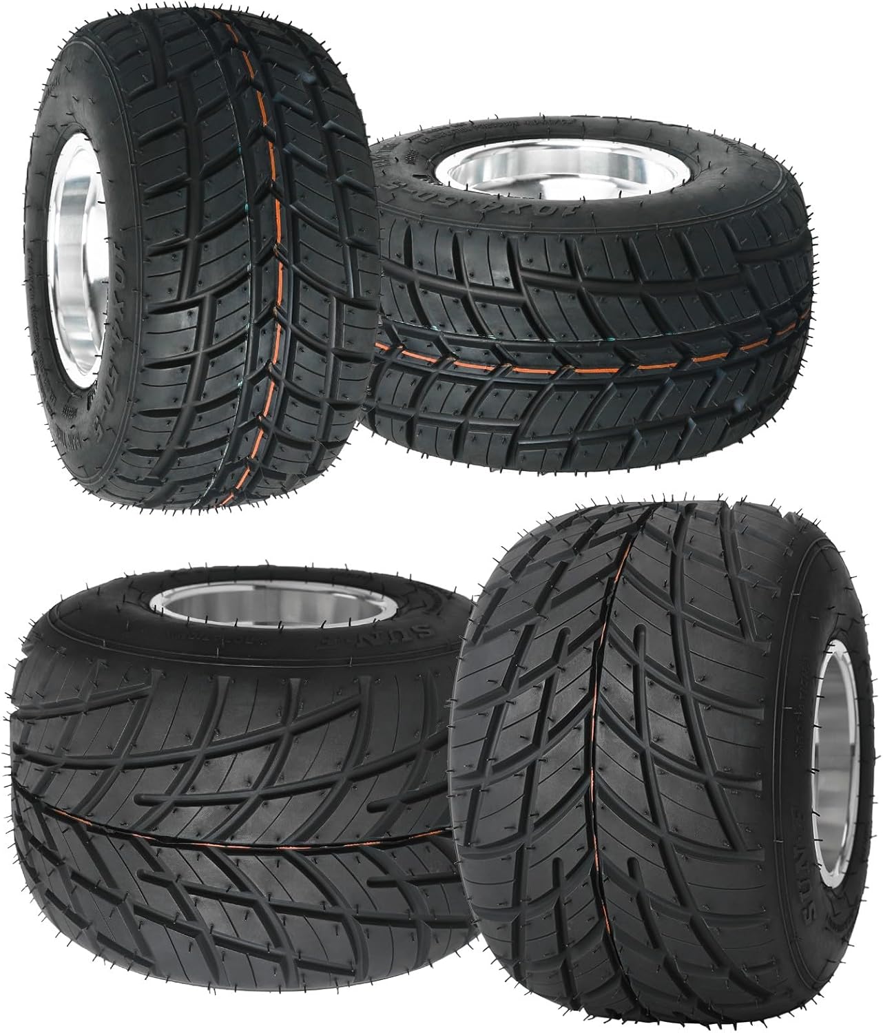 Product Features and Specifications:Front Wheel Size: 10x4.50-5; ideal for ensuring optimal handling and speed on the track.Rear Wheel Size: 11x7.10-5; provides enhanced stability and traction for competitive racing and recreational use.Rim Material: Durable aluminum rims designed for lightweight strength and performance.Tire Type: Specially designed for go karts and trikes, suitable for both racing and leisure activities.Stud Pattern: Both front and rear wheels feature a 3-stud pattern for secure and straightforward mounting.Key Features:Optimized Tread Design: Ensures excellent grip and efficient water evacuation for superior performance in all weather conditions.High-Quality Construction: Aluminum rims paired with robust tires for longevity and consistent performance.Easy Installation: Pre-mounted tires on rims for a hassle-free setup, allowing for immediate replacement and use.Versatile Application: Suitable for racing go karts, drift trikes, and other karting applications requiring high-speed stability and precise handling.Aesthetic Appeal: Sleek, professional design that not only performs well but also enhances the appearance of your vehicle.Compatibility:Designed to fit a wide range of go karts and trikes.Compatible with vehicles that accommodate 10x4.50-5 and 11x7.10-5 tire sizes and a 3-stud wheel pattern.Package Includes:2x Front Wheels (10x4.50-5)2x Rear Wheels (11x7.10-5)