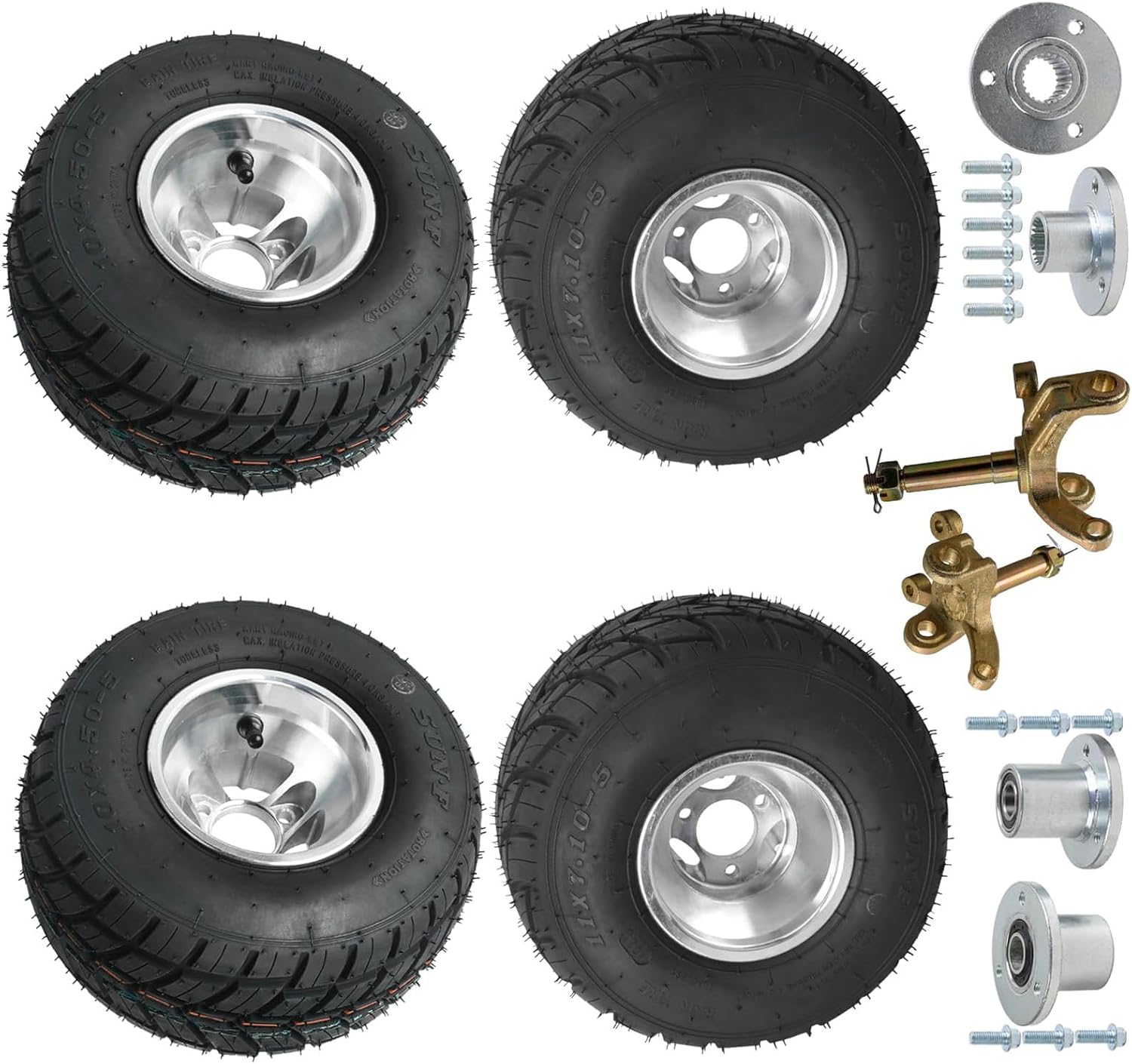Upgrade your go kart or off-road vehicle with this complete 10x4.50-5 and 11x7.10-5 wheel assembly kit, engineered for high performance in wet and rainy conditions. ✔ Front Wheel Assembly Tire Size: 10x 4.50-5 (Rain Tire) Type: Tubeless, pre-mounted on aluminum rim Height: 260mm (10.24") Width: 135mm (5.31") Bolt Hole Size: 8.5mm (0.33") Bolt Hole Spacing: 50mm (1.97") Wheel Hub Offset: 32mm (1.26") ✔ Rear Wheel Assembly Tire Size: 11x7.10-5 (Rain Tire) Rim Size: 5" 3-lug Height: 280mm (11.02") Width: 180mm (7.09") ✔ High Performance 4PR Tubeless Tires Designed for wet racing and slippery surfaces, these 4-ply tubeless tires offer improved traction and durability. Rated for a maximum inflation of 57 PSI. Not for highway use. ✔ Universal Fitment Compatible with a wide range of vehicles including ATV, UTV, go kart, quad, buggy, golf cart, lawn mower, and drift trikes using 3-stud 5" rims. ✔ Package Includes 2 x 10x 4.50-5 Front Tires with Rim (Rain Tire) 2 x 11x7.10-5 Rear Tires 2 x Front Wheel Hubs 2 x 23T Rear Axle Hubs 2 x Steering Knuckles A complete and reliable wheel upgrade kit for performance handling in wet conditions.