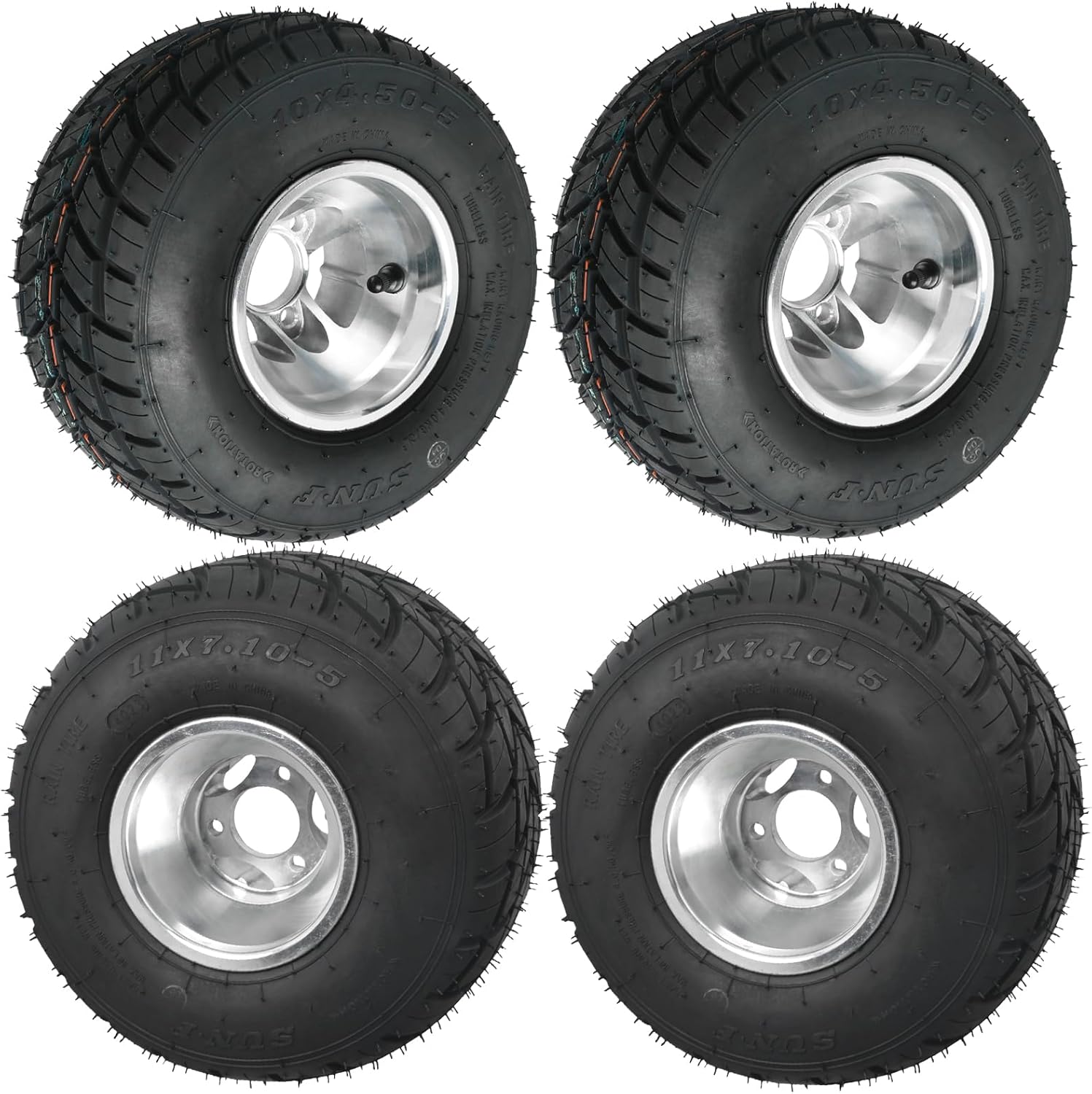๐๐ข๐ซ๐ โ Rain tire, 10x 4.50-5, 10x 4.50x5 ๐๐ข๐ฆ โ Aluminum, 3 stud ๐๐ก๐๐๐ฅ ๐๐ข๐ณ๐ โ Height: 260mm (10.24 inch), Width: 135mm( 5.31 inch); Bolt hole size: 8.5mm (0.33 inch); Bolt hole Spacing: 48mm (1.89 inch); Wheel hub offset: 32mm (1.26 inch) ๐๐ข๐ ๐ก ๐๐๐ซ๐๐จ๐ซ๐ฆ๐๐๐ โ 4ply rating tubeless, Max inflation 57 P.S.I, Not for high way use ๐ ๐ข๐ญ๐ฆ๐๐ง๐ญ โ Universal for ATV UTV 4 Wheelers Go Kart Golf Cart Buggy Quad Lawn Mower Drift Trike ๐๐๐๐ค๐๐ ๐ ๐๐ง๐๐ฅ๐ฎ๐๐๐ฌ โ 2 Pack 10x 4.50-5 go kart tires with rim (Rain tire)