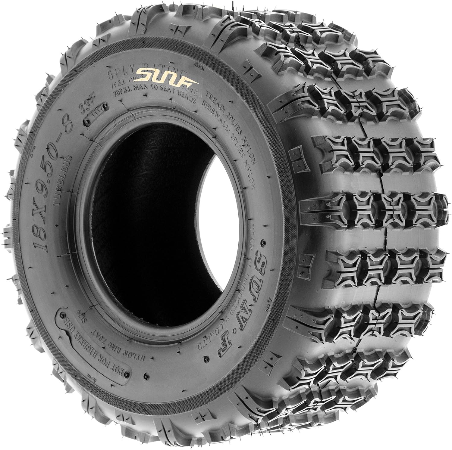 SunF Corporation has dedicated themselves to meeting their customer’s demands and needs. SunF develops and manufactures a wide variety of quality tires in the specialty market. Their line up includes ST trailer, lawn and garden, agriculture, golf cart, ATV/UTV, light truck and off road Mud Terrain tires compatible with popular ATV/UTV brands such as Honda, Yamaha, Suzuki, Arctic Cat, Can-Am Bombardier, Kawasaki, Polaris and more. Specifications Front: Size: 19x7-8 PLY: 4 Standard Rim:8''x 5.5'' Load: 220 lbs Tread: 0.25 in/ 6mm Rear: Size: 18x9.5-8 PLY: 4 Standard Rim:8''x 7'' Load: 225 lbs Tread: 0.37 in/9.5 mm