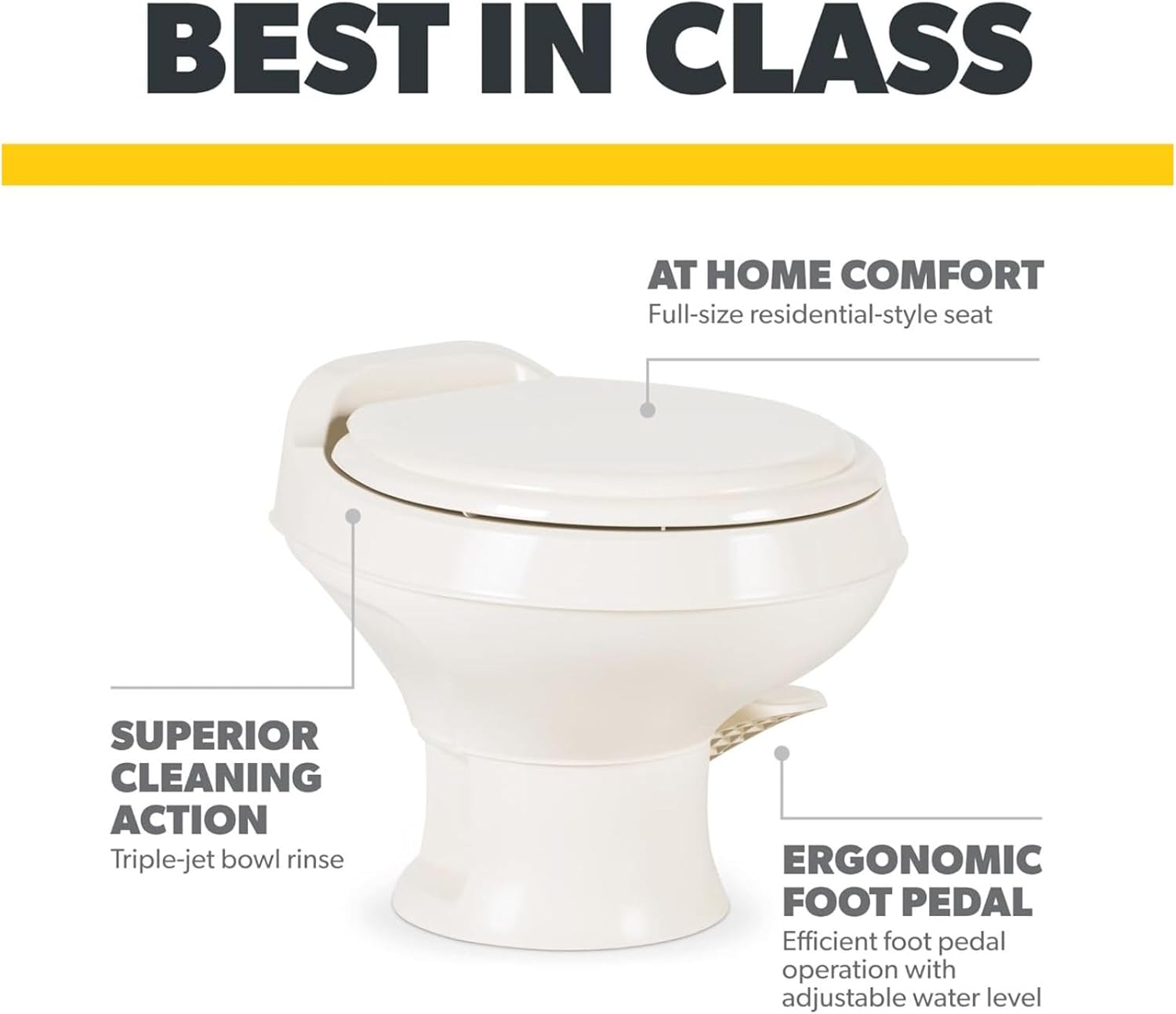 | Included Components | 1 Manual, Dome-Tic Toilet Bone Color Low Profile 135 Inch | Seat Height Slow Close Seat Power Flush Foot Pedal Toilet for Camper Motorhome Travel Trailer | 302311683 |