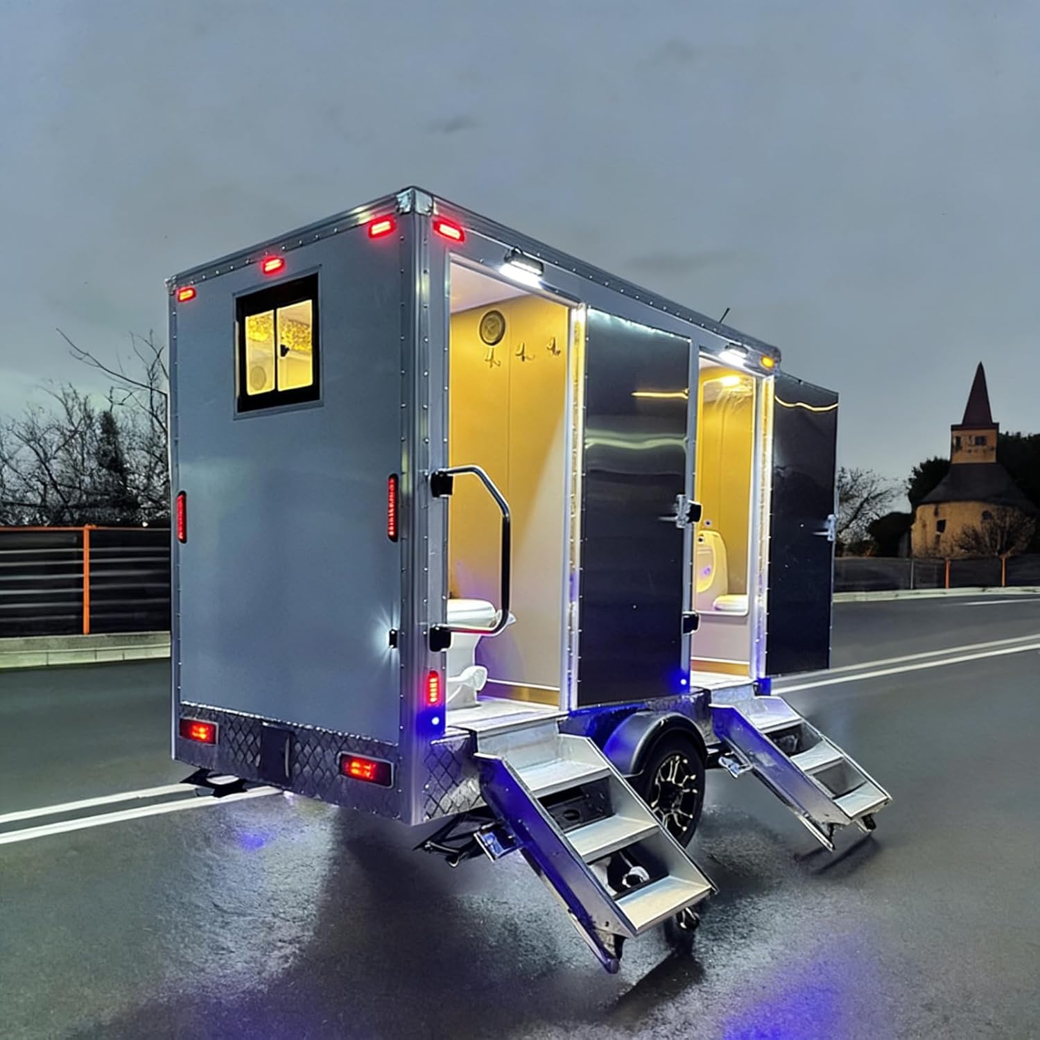 Product name: Restroom trailer Origin: Henan, China Product type: Mobile restroom Application: Outdoor toilet Design style: Modern Interior: Toilet, urinal, sink/customizable Use: Wedding site, construction site, festival event, large party Keywords: Mobile restroom trailer, portable toilet trailer, outdoor bathroom trailer Warranty: 1 year Condition: New Factory video inspection: Provided Mechanical inspection report: Provided
