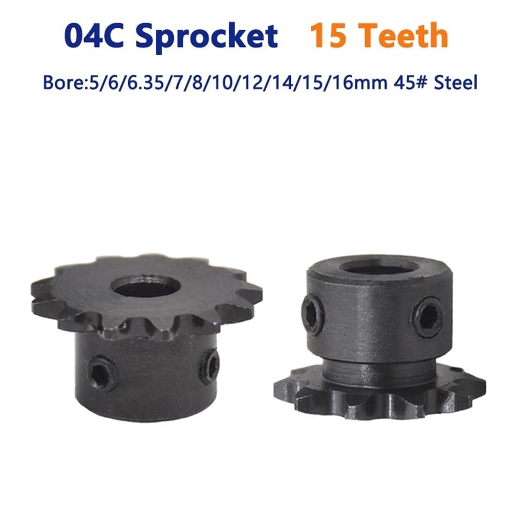 Specification:Name: Sprockets Chain GearType: 04CMaterial: 45# SteelSurface Treatment: BlackeningPitch: 6.35mmTeeth: 15 TeethBore: 6/6.35/7/8/10/12/14/15/16mm (Round Hole)Bore: 8/10mm(keyway 3mm),10/12mm(keyway 4mm) (Keyway Hole)E.g.: 12mm(key 4mm)-groove (Bore=12mm, keyway=4mm, step with groove)Application: For use with roller chainsPackage includes: According to your choice.