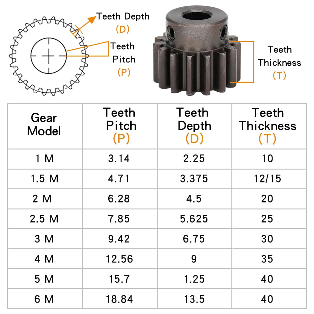 1.5 M Spur Gear1.Product Model : 1.5M-30T2.Material : SC45#Carbon Steel3.Surface Treatment : High Frequency Quenching+Blackening4.Teeth Pitch : 4.71 mm5.Teeth Depth : 3.375 mm6.Teeth Thickness : 12 mm7.Gear Total Height : 20 mm8.Package :Spur Gear+M5*2The main picture is a display picture of some models and sizes, depending on your choice.Note:The gear is a carbon steel product, and there may be rust on the surface, but it will not affect the product efficacy and use.