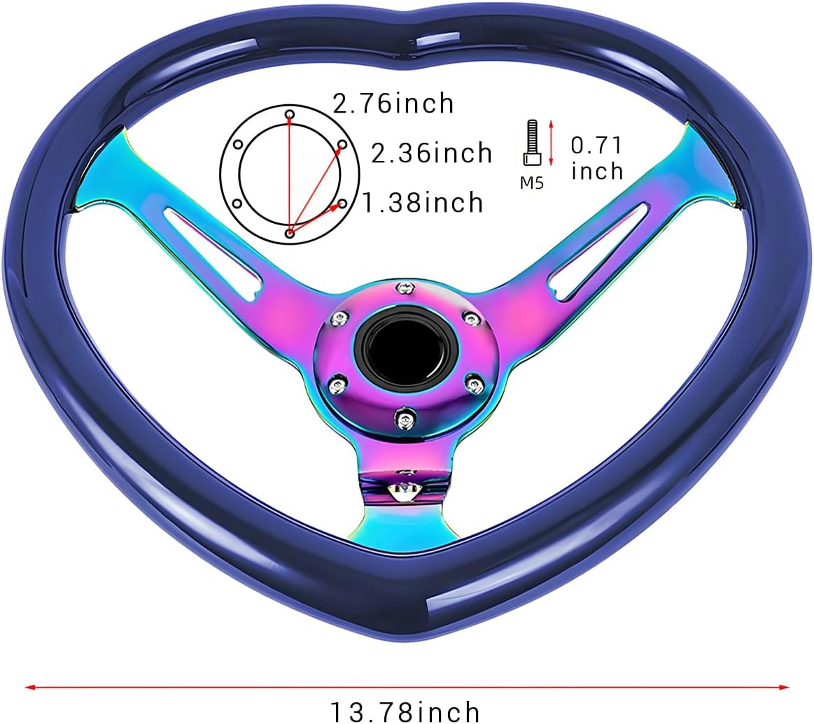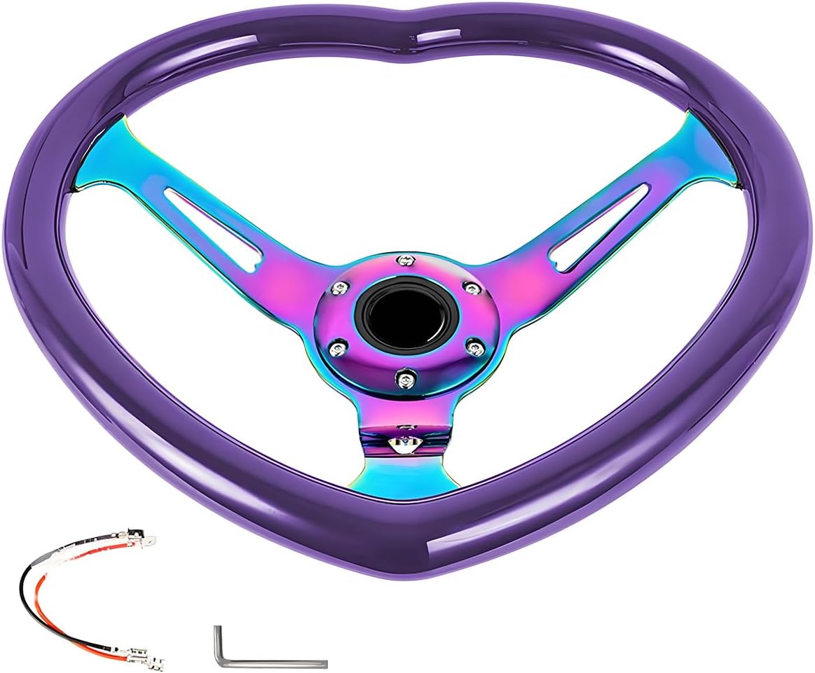 Description Upgrade your driving experience with our Universal Heart-Shaped Racing Steering Wheel. Whether you're a car enthusiast, , or just someone who loves a cute aesthetic, this unique heart design adds charm and attitude to your interior. Made from durable aluminum alloy and wrapped in high-quality ABS, this steering wheel delivers both performance and style. The compact 13.8inches size gives a sporty feel while maintaining full control of your vehicle, making it perfect for street cars, drift setups, or show cars. Installation is quick and easy with any standard 6-bolt steering wheel hub adapter (not included). Plus, with 6 vibrant colors to choose from, you can personalize your ride to reflect your personality. Whether you're racing, drifting, or simply cruising, this heart-shaped steering wheel will make you fall in love with driving all over again. Specifications: Material: Aluminum Frame & ABS Grip Compatibility: Universal 13.8inch Color Options: Black, Purple, Green, Pink, Blue, White Weight: 2.87lb Package Included: 1 * Steering Wheel 1 * Wrench 2 * Cable