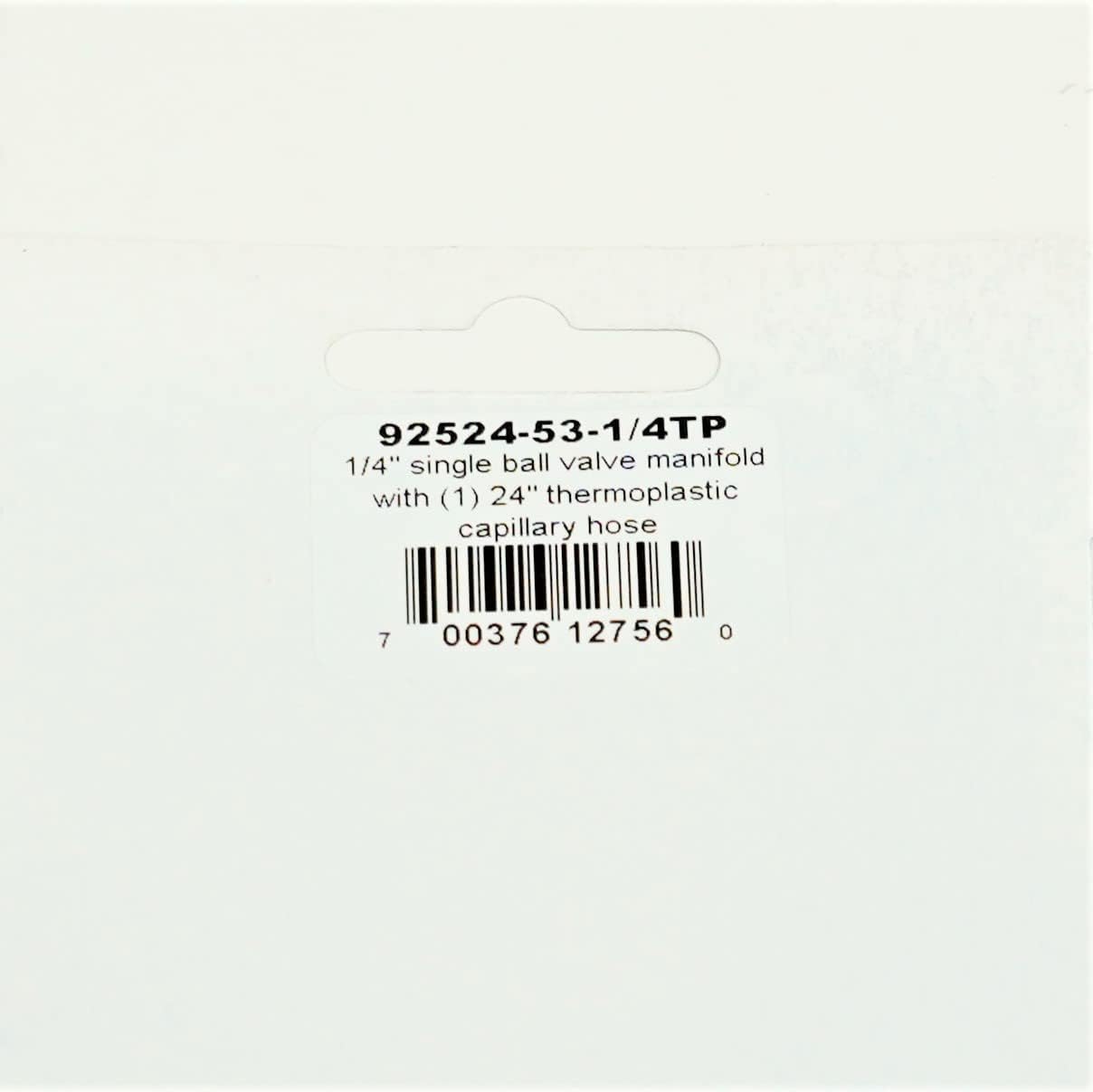 Mastercool part number 92524-53-1/4TP.Single Valve Manifold Assembly.Includes manifold, and a 24" skinny charging hose.Specifications:0.08" (2mm) ID x 18" thermoplastic capillary hoseUse with Hydrocarbon Refrigerant gasses R600a (Iso-Butane), R290 (Propane) and R134AHose Length: 24"From the manufacture:Product DescriptionLarge 3 1/8: gauges (PSI/F) with easy to read temperatures scalesIncludes 2 mm thermoplastic capillary hose with straight x 45 fittings with depressor for maximum precision on small capacity systems92524-53-1/4TP: 1/4" single ball valve manifold with (1) 24" thermoplastic capillary hose packaged in a clamshell