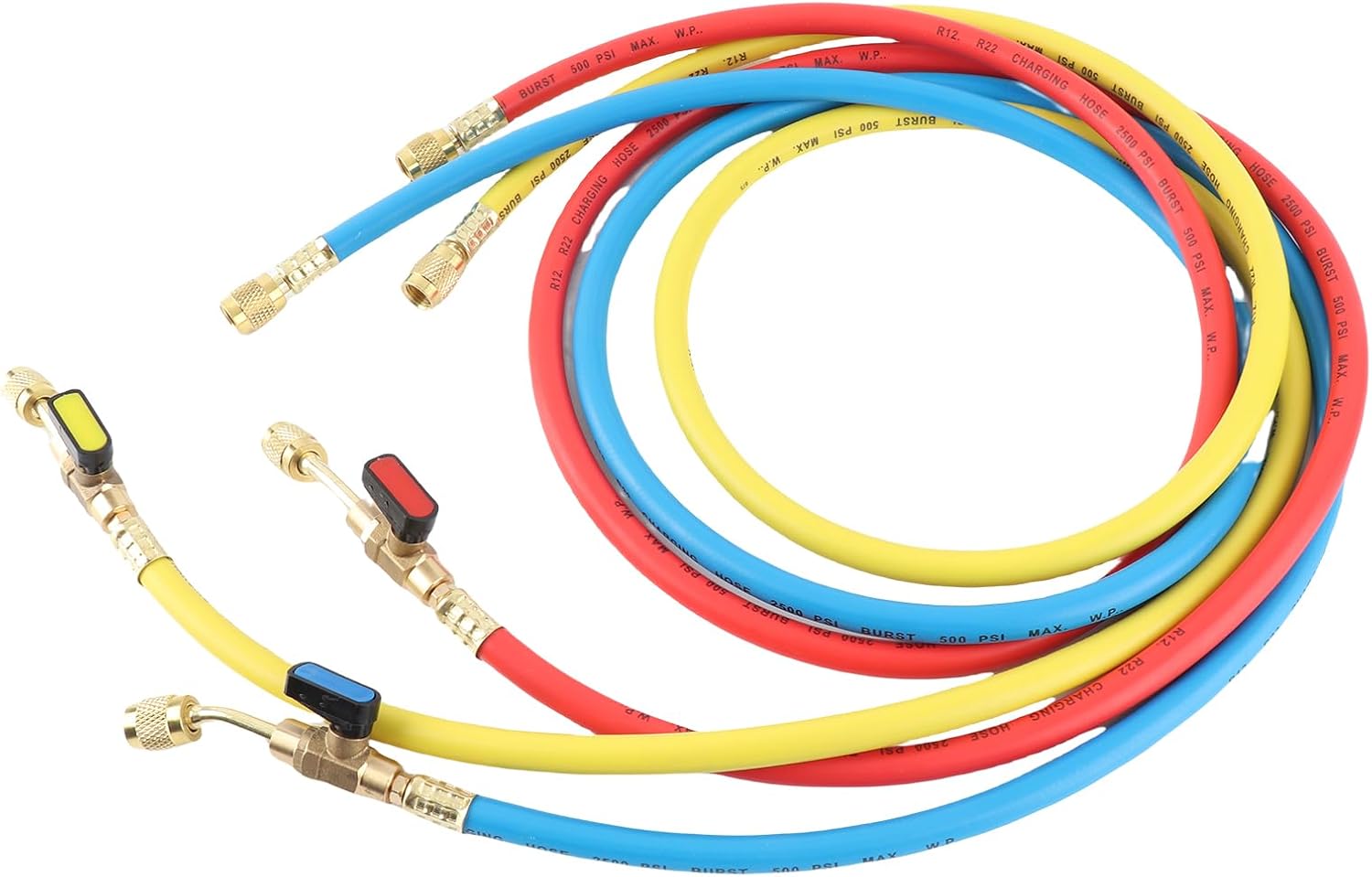 [HIGH-PRESSURE RESISTANCE] Designed to withstand up to 500 PSI working pressure and 2500 PSI burst pressure for safe and efficient operation.[CONVENIENT ACCESS] Features standard 1/4 inch female flare fittings with a valve core depressor and a 45° bend, allowing easy access to the system.[EASY INSTALLATION & OPERATION] Simple to install and operate, ensuring enhanced durability and safety with strong sealing. An essential tool for HVAC and car maintenance.[WIDE COMPATIBILITY] Meets 1/4" SAE requirement for refrigerant permutation, compatible with R12, R22, and R502 refrigerants for versatile use.[PACKAGE CONTENT] Includes 3 hoses in red, blue, and yellow, each 150cm/59.06inch long. Coupler nuts are deeply knurled for quick finger-tightening.Spec:Item Name: A/C Charging Hose SetMain Material: Metal, RubberApplicable Refrigerant: R12, R22, R502Thread Size: 1/4 inchOverall Length: 150cm/59.06inchRefrigerant Charging Hoses: 500PSI working pressure, 2500 PSI burst pressureColor: MulticolorPackage Information: Package Size: 33*21.5*5cm/12.99*8.46*1.97inchPackage Weight: 733g/1.62lbNote: