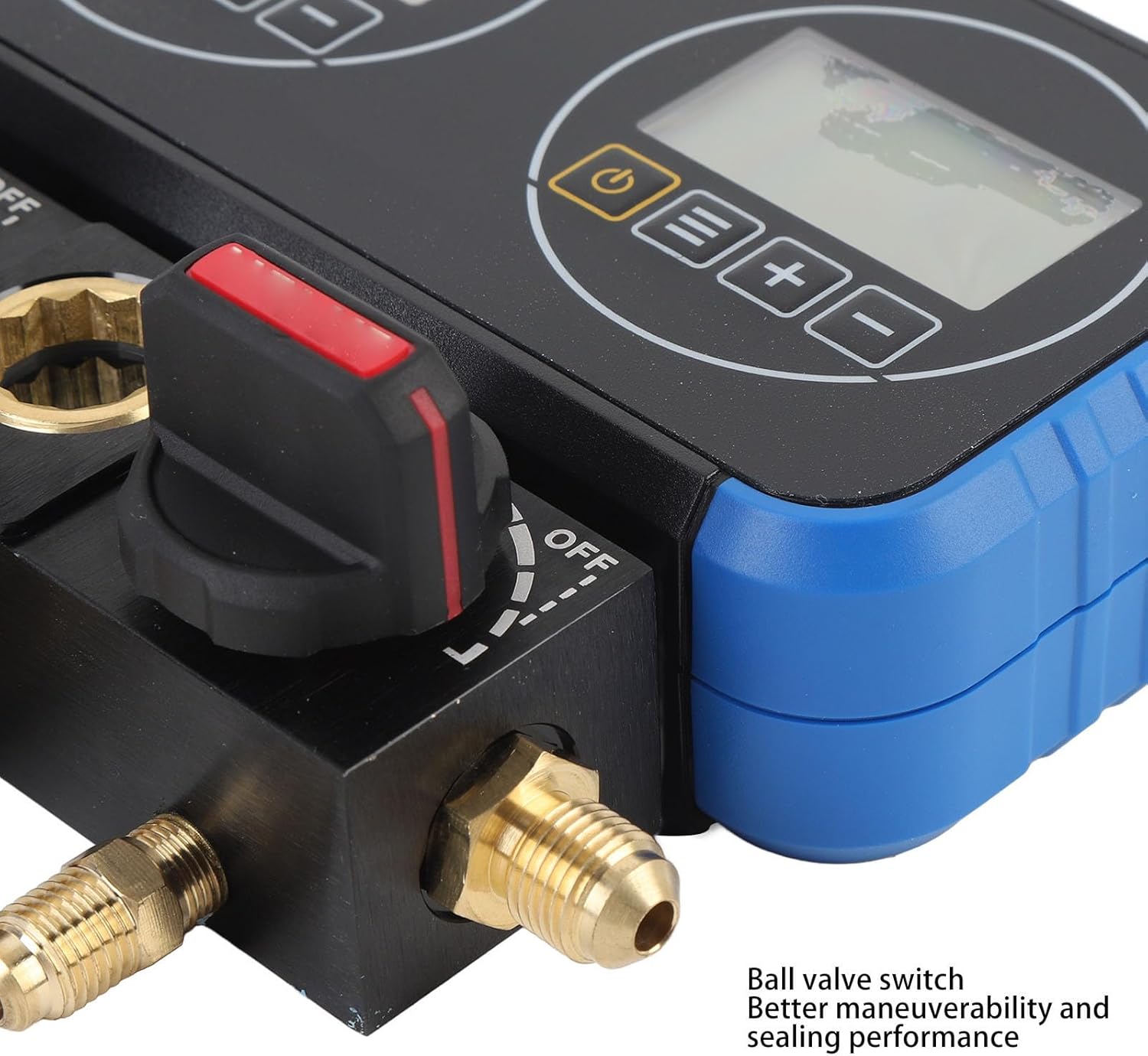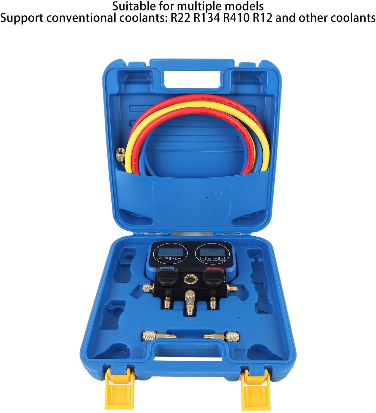 Spec: Item Type: Digital Manifold Gauges Material: ABS, Alloy Not Applicable Media: NH3 (R717) and NH3 containing coolant Maximum Overload Pressure: 75 bar, 1087 psi, 7.5 MPa, 76.5 kgf/cm², 7500 KPa Pressure Range: 0-50 bar, 0-720 psi, 0-5 MPa, 0-51 kgf/cm², 0-5000 KPa (relative pressure) Vacuum Range: -29.9~0 inHg Resolution: 0.1 bar, 0.1 psi, 0.001 MPa, 0.1 kgf/cm², 1 KPa, 0.1 inHg Measurement Accuracy: ±0.2 bar, ±2 psi, ±0.02 MPa, ±0.2 kgf/cm², ±20 KPa, ±1 inHg (at 22℃) Units: bar, psi, MPa, kgf/cm², KPa, inHg, ℃, ℉ Coolant: R22, R32, R134A, R290, R404A, R407A, R407C, R410A, R426A, R427A, R434A, R442A, R448A, R449A, R450A, R452A, R453A, R454B, R507A, R510A, R513A, R600A, R1234YF (R922B) Sensor: 2x pressure sensors (1 second detection frequency) Interface: 3x7/16in-20UNF (1/4in SAE) Auto Shutdown Time: 15 minutes Backlit Time: 3 minutes Battery: 20 hours 9V LR type dry battery x 2 (not included) Working Temperature: -10~50℃ (14~122℉) Storage Temperature: -20~60℃ (-4~140℉) Standard: /T 7392-2006 Package List: 1 x Digital Manifold Gauges 3 x Hoses 1 x Adapter 1 x Storage Box How To Use: 1. Must be operated by professional personnel familiar with vacuum systems and possessing industry qualifications. 2. Before use, check if the coolant used in the gauges set is compatible with the system coolant. 3. Properly connect the high and low pressure hoses, ensuring that the system pressure being measured does not exceed the gauges set range. 4. Clean the connection interfaces before use to prevent air leakage and foreign object entry into the system. 5. Wear protective gloves and goggles during use to prevent touch of coolant with the skin and eyes, causing damage to the human body. 6. This product is not suitable for areas with explosion proof requirements and is not suitable for coolant containing NH3. 7. This product is a