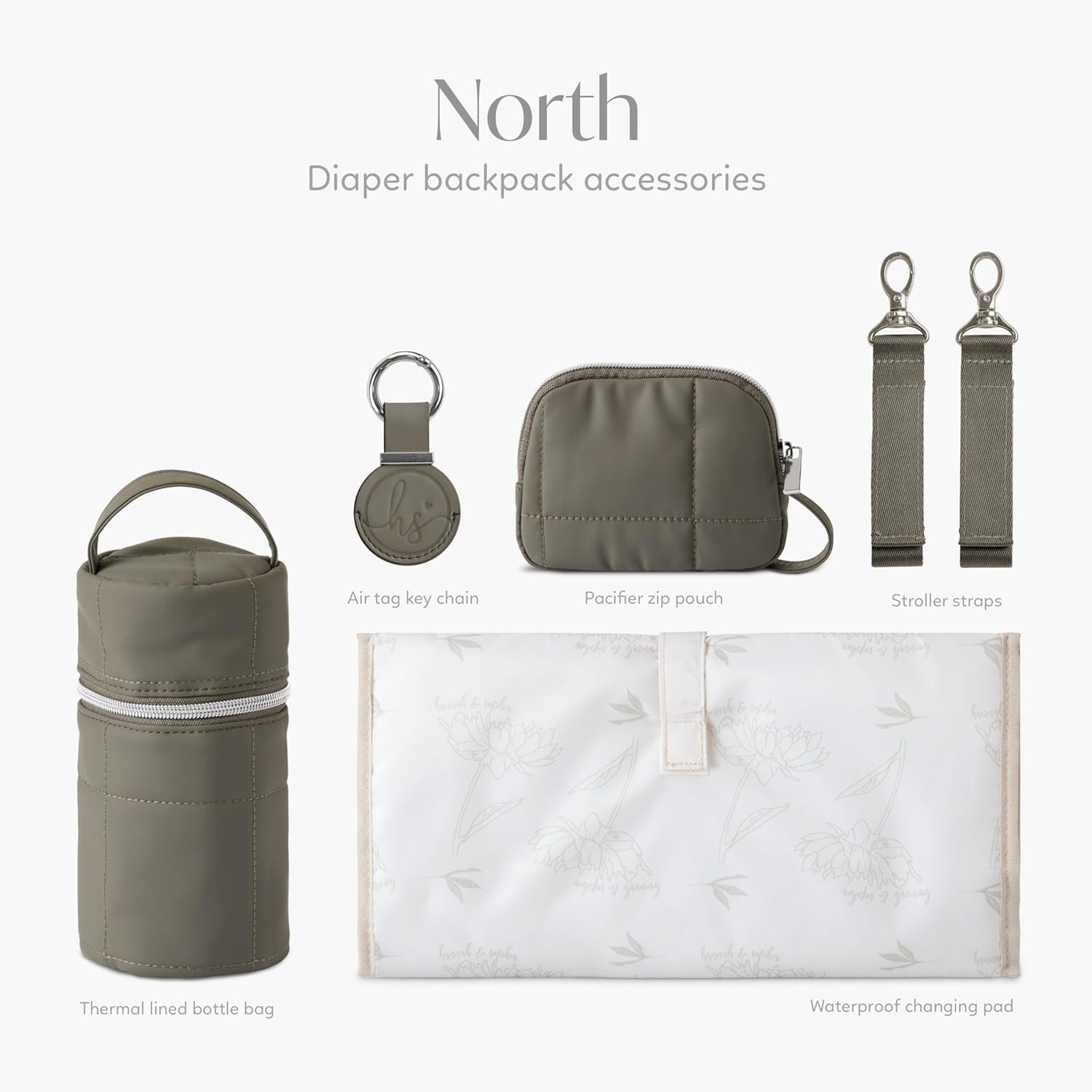 "The Hannah & Sophia North Diaper Backpack is designed to make everyday outings feel more organized and easier to manage. From short errands to longer day trips, it offers a structured, easy-to-carry solution for keeping baby essentials close at hand without feeling bulky or difficult to maintain. The smooth PU exterior helps the bag maintain a polished look while allowing for easier cleanup after everyday spills and messes. Inside, the layout is designed to support organized packing, with space for feeding, changing, and daily essentials, along with included accessories that support on-the-go routines. Designed with a reinforced interior lining to support regular use and organization. A lightweight build, structured interior, and travel-friendly storage features make it suitable for parents looking for both function and a refined everyday diaper bag."